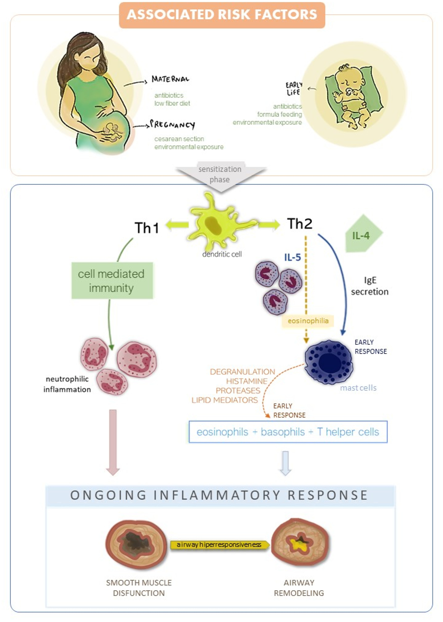 Associated risk factors and asthma development. There are two inflammatory responses in asthma: Th1 and Th2 mediated. Th2 is the most common and leads to an early response by IgE production, presence of eosinophilia and mast cell recruitment. Late response in Th2 mediated asthma recruits' eosinophils, basophils and T helper cells to the mucosa leads to inflammatory response. Th1 mediate cell immunity in asthma, with neutrophilic inflammation affecting the epithelial layer. Both Th1 and Th2 cause airway hyper responsiveness, smooth muscle disfunction and airway remodeling.