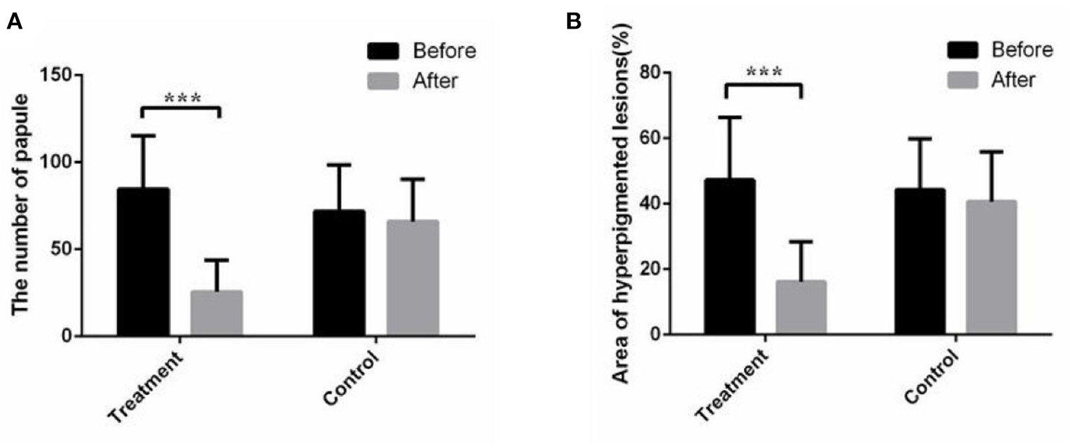 The combined therapy reduced the number of papules and facial hyperpigmented area in the treatment group. (A) Average total number of papules/pustules before and after treatment in the treatment group and control group. (B) Average facial hyperpigmented area (%) before and after treatment in the treatment group and control group. The results are expressed as the mean ± SD. ***p < 0.001.