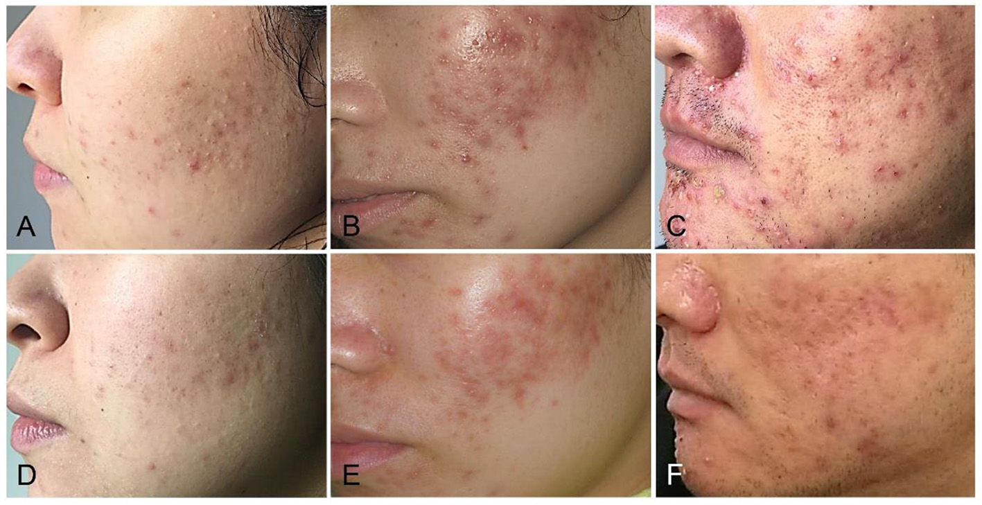 The combined therapy improved the acne condition in patients with mild to severe acne. (A,D) Representative photographs of mild acne patients before and after 2 months of the combined treatment. (B,E) Representative photographs of moderate acne patients before and after 2 months of the combined treatment. (C,F) Representative photographs of severe acne patients before and after 2 months of the combined treatment.
