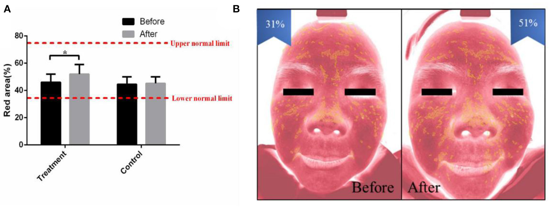 The combined therapy decreased the red area in the treatment group. (A) The proportion of red area before and after treatment in the treatment group and control group. (B) Representative pictures of a 27-year-old female taken by intelligent facial detection in the treatment group, which shows the comparison between the red area values before and after treatment. The results are expressed as the mean ± SD. *p < 0.05.