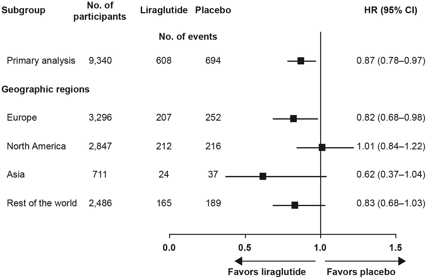 The FDA convened an advisory committee meeting to discuss the LEADER results. In its briefing presentation on the subgroup analyses, the FDA reported the following (21):