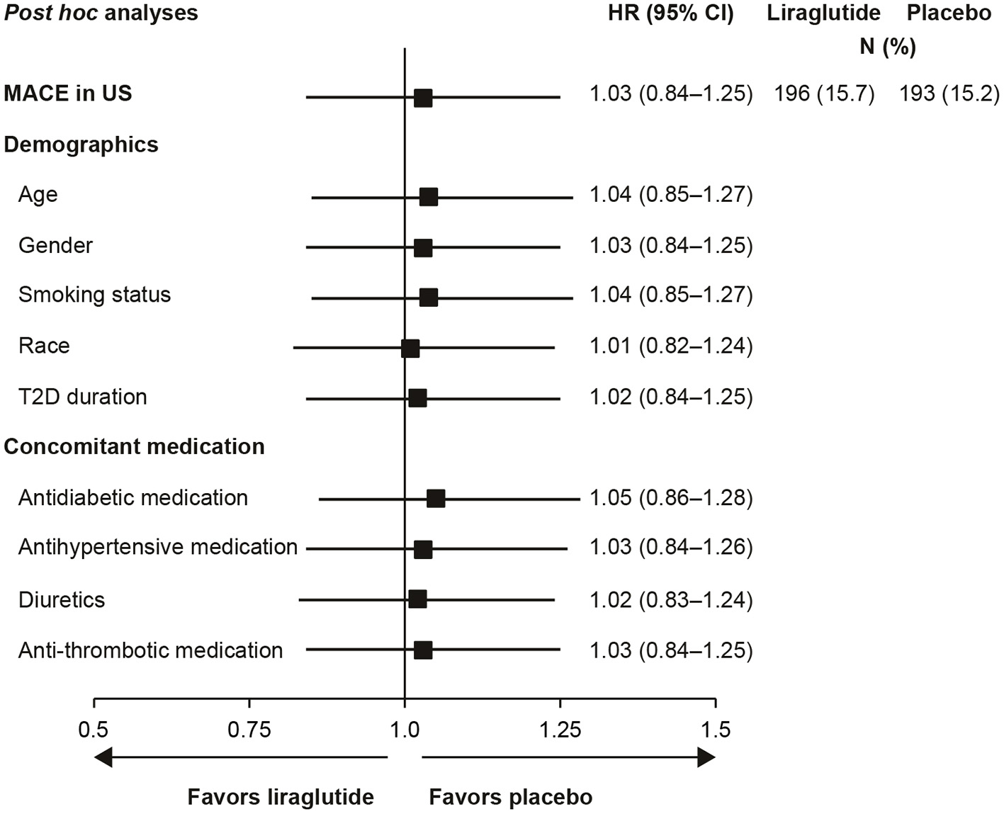 Analysis of time to first MACE in US participants with adjustment for baseline demographics and concomitant medications (29). Full analysis set; HR with 95% CI. Each row presents results of a Cox proportional hazards model with treatment as factor and adjustment for each baseline demographic variable or concomitant medication. All HRs are for the comparison of liraglutide to placebo. CI, confidence interval; HR, hazard ratio; MACE, major adverse cardiovascular event; N, number of patients with an event; T2D, type 2 diabetes; US, United States.