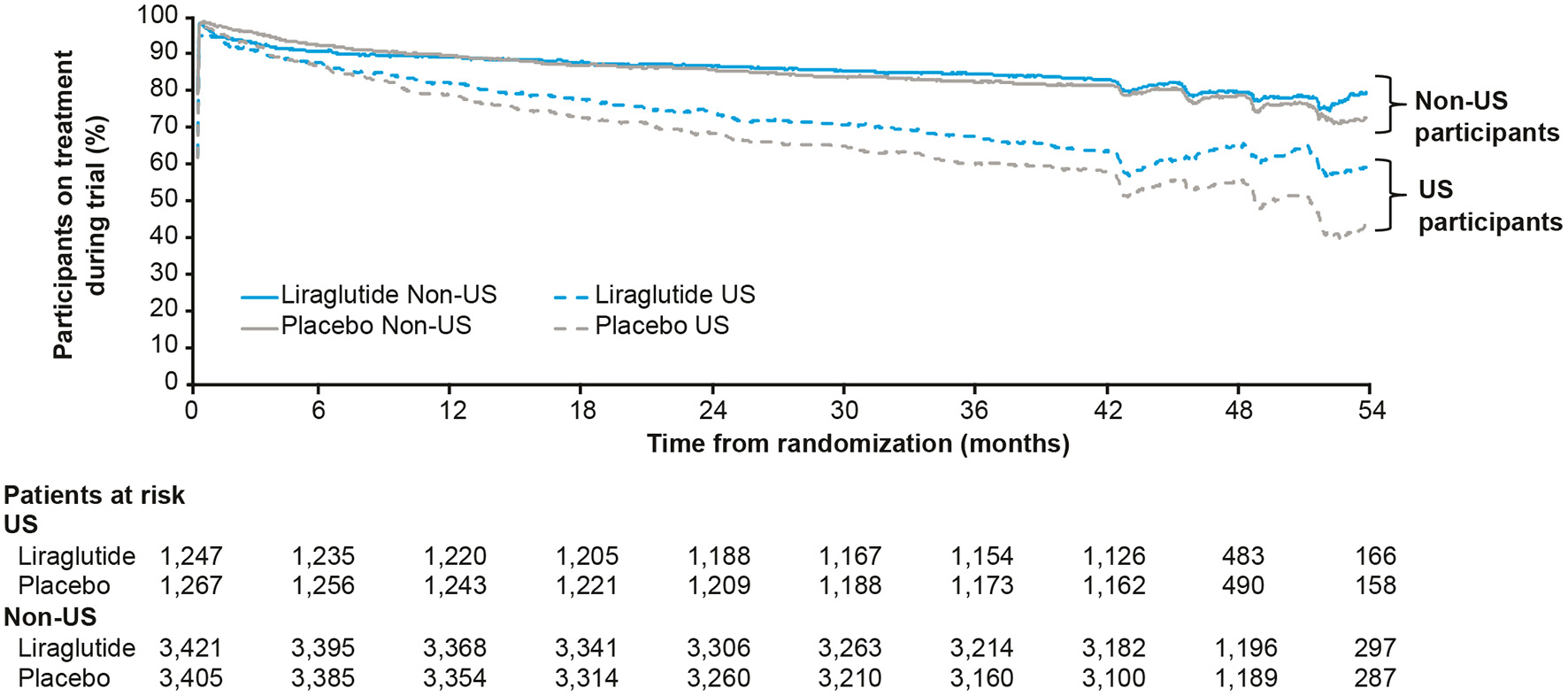 Percentage of US and non-US participants on treatment with liraglutide or placebo during the LEADER trial (30). Full analysis set. US, United States.