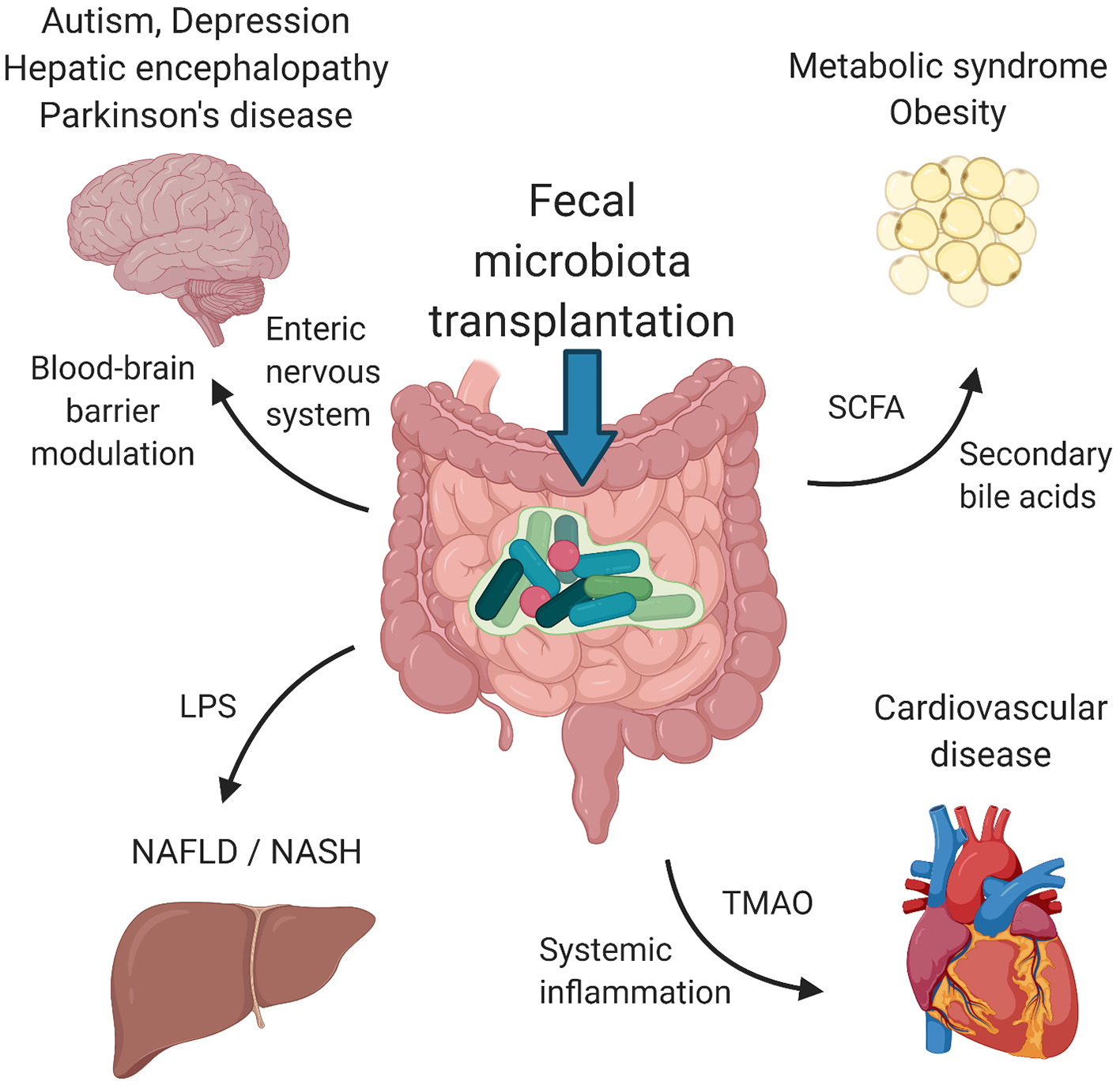 Suggested mechanisms of FMT. Signaling via enteric nervous system and blood-brain barrier modulation by microbial metabolites influence psychiatric/neurological disorders, including autism spectrum disorders, depression, hepatic encephalopathy and Parkinson's disease. Metabolic syndrome and obesity seem to be modulated by the presence of SCFA and secondary bile acids produced by bacteria. LPS and other structural molecules from bacteria entering the portal circulation affect the liver health. Cardiovascular health was found to be regulated by bacterially produced TMAO as well as systemic inflammation induced by the presence of circulating bacteria and their metabolites. FMT, fecal microbiota transplantation; SCFA, short chains fatty acids; LPS, lipopolysaccharide; TMAO, trimethylamine-N-oxide. Created with BioRender.com.