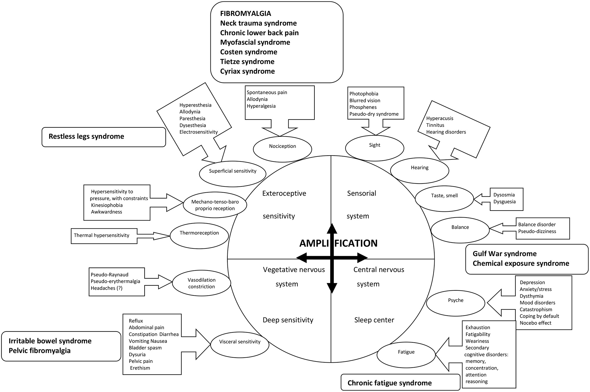 Figure 2. The different paths to the origin of the stimuli responsible for the symptomatology in fibromyalgia are illustrated in the bubbles, with the associated signs in the boxes linked by arrows. The stimuli at the origin of the associated symptoms of fibromyalgia are either of exteroceptive origin, or profound, or related to the neuro-vegetative system, all with medullary relays, or in relation to sensoriality and its bulbar relays, or even central origin with regard to the psyche or fatigue. Each time, there is chronicization and amplification of the signal, which can thus only be done at the central level. The supposed mechanism is either abnormal amplification of the signal itself, or inhibition of the retrocontrol system, or a quantitative decrease in the perception threshold for the signal. A few entities (in bold in the boxes with rounded corners) are the subject of specific names in relation to the more specific predominant symptomatology, but with clear ties with fibromyalgia in the context of the hypersensitization which is common to all these syndromes.