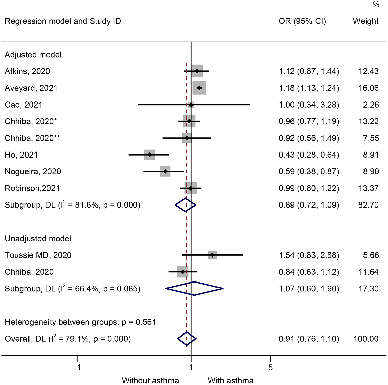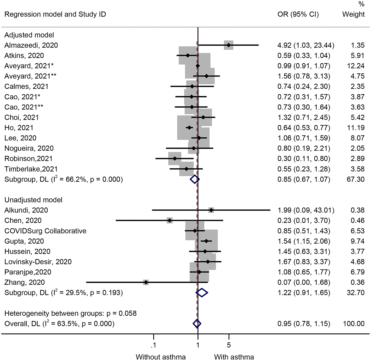 Forest plot of mortality comparing patients with or without preexisting asthma by the model applied. Weights and between-subgroup heterogeneity test are from random-effects model.