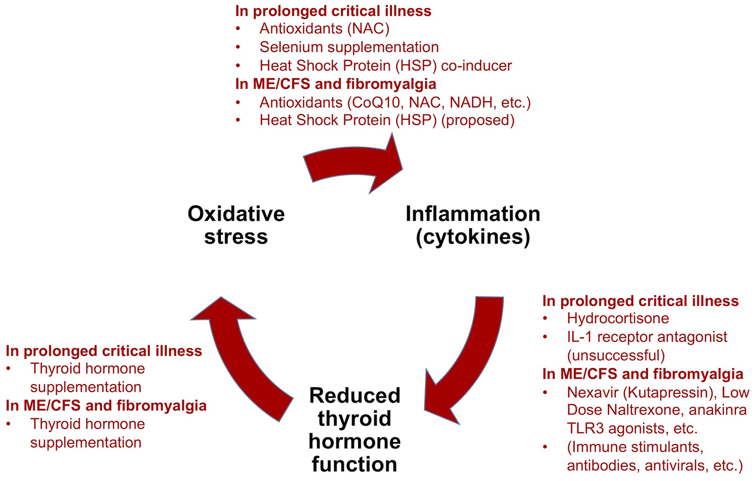 Critical illness researchers have proposed a model for how prolonged critical illness is perpetuated by reciprocal relationships between inflammation (notably pro-inflammatory cytokines), O&NS and reduced thyroid hormone function (13, 16). Simplified, this model suggests that (i) cytokines depress thyroid hormone function; (ii) low thyroid hormone function contributes to O&NS; and (iii) O&NS in turn stimulates the production of pro-inflammatory cytokines, thereby completing a “vicious circle.” Moreover, reciprocal relationships between these elements and the suppressed endocrine axes [e.g., pro-inflammatory cytokines suppress ACTH release (9, 10); weakened adrenals permit excessive inflammatory responses] contribute to perpetuate a hypometabolic and inflammatory state (208), and thus help to explain why some critically ill patients fail to recover. Crucially, the same elements of such a “vicious circle” have also been documented in ME/CFS (134, 209–216)—as described in our earlier publication (34).