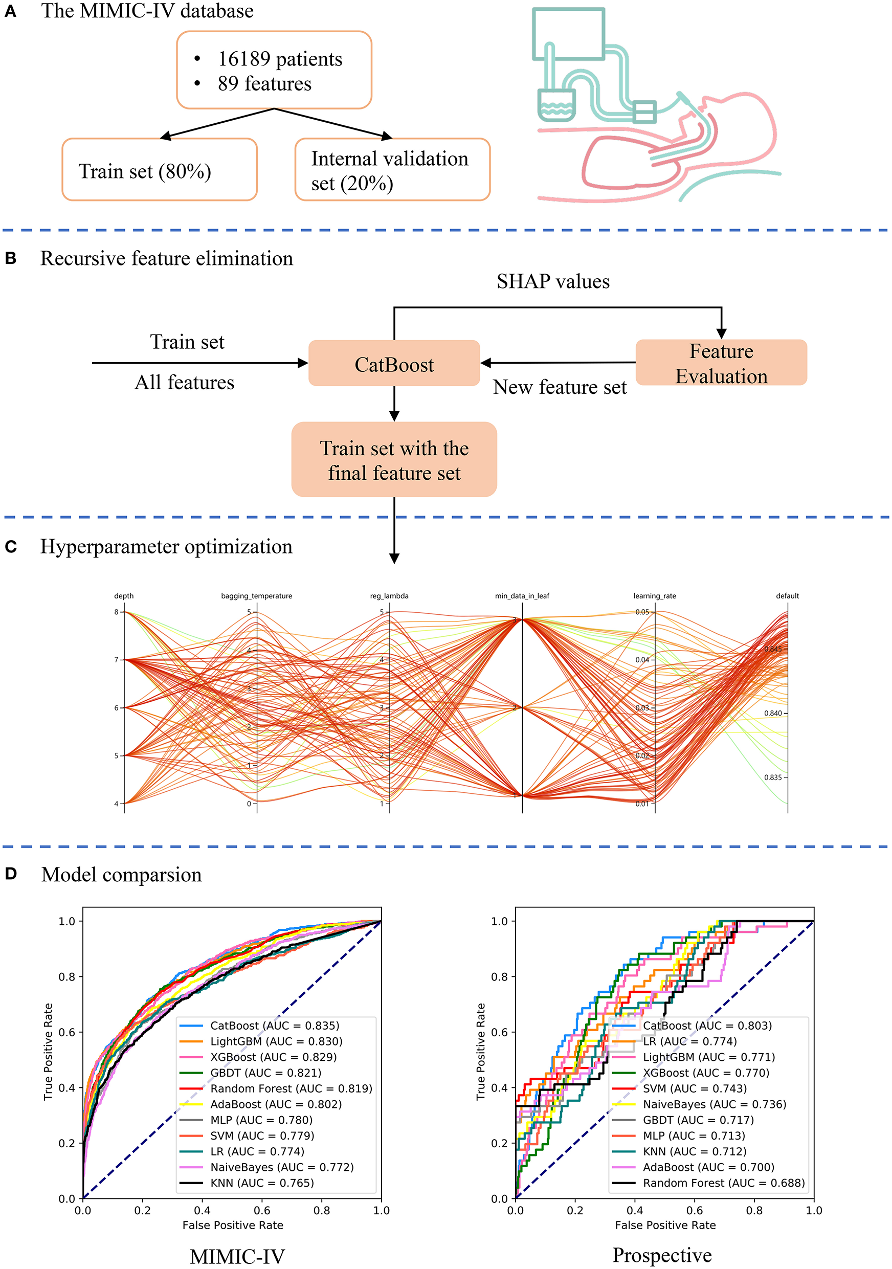 Schematic illustration of the study design. (A) Patients who underwent extubation in the Medical Information Mart for Intensive Care (MIMIC)-IV database were included in the study and 89 variables were extracted. The dataset was divided into train set (80%) and internal validation set (20%). (B) The recursive feature elimination algorithm was performed based on the train set, and key features were selected. (C) Hyperparameters was optimized using an automated machine learning toolkit on the train set. (D) The developed CatBoost model outperformed other models both in the internal validation and prospective validation sets.