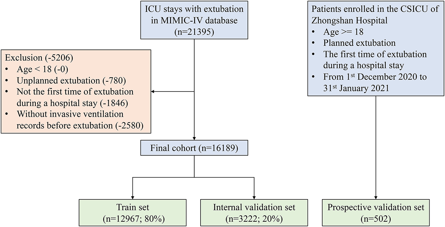 In the MIMIC-IV cohort, patients who underwent extubation during ICU stays were included. The exclusion criteria were as follows: (i) age <18 years, (ii) unplanned extubation, (iii) not the first extubation during the hospital stay, or (iv) no MV records before extubation. In the ZS cohort, all eligible patients that did not meet the exclusion criteria described above from December 2020 to January 2021, were prospectively enrolled. Written consent was obtained from patients' legally authorized representatives upon admission to the ICU.