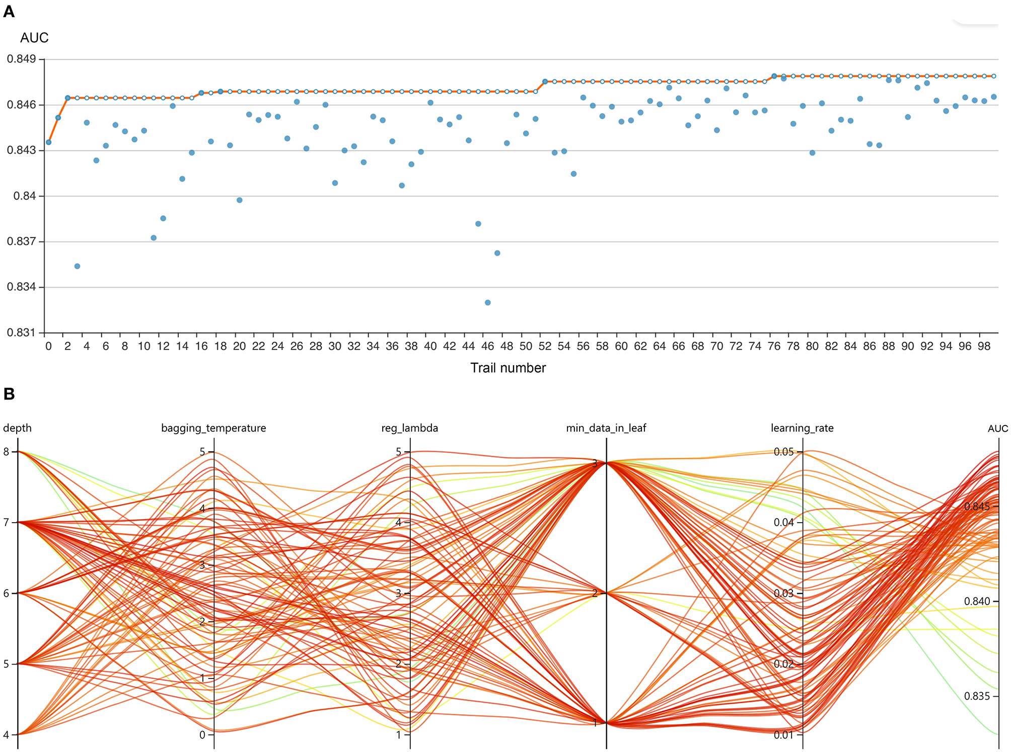 To further improve the model performance, hyperparameter tuning was conducted using an automated machine learning toolkit called Neural Network Intelligence (NNI) designed by Microsoft Research. We chose the Tree-structured Parzen Estimator (TPE), one of the sequential model-based optimization algorithms, as the tuning algorithm. TPE sequentially constructed models to approximate the performance of hyperparameters based on historical measurements, and then subsequently chose new hyperparameters to test based on this model (26). The hyperparameter search domain is summarized in Supplementary Table 2. One hundred trials were carried out and the parameters with the greatest area under the receiver operating characteristic (AUROC) were saved. A compact CatBoost model using the saved parameters was then trained based on the selected features, and then validated in the validation sets.