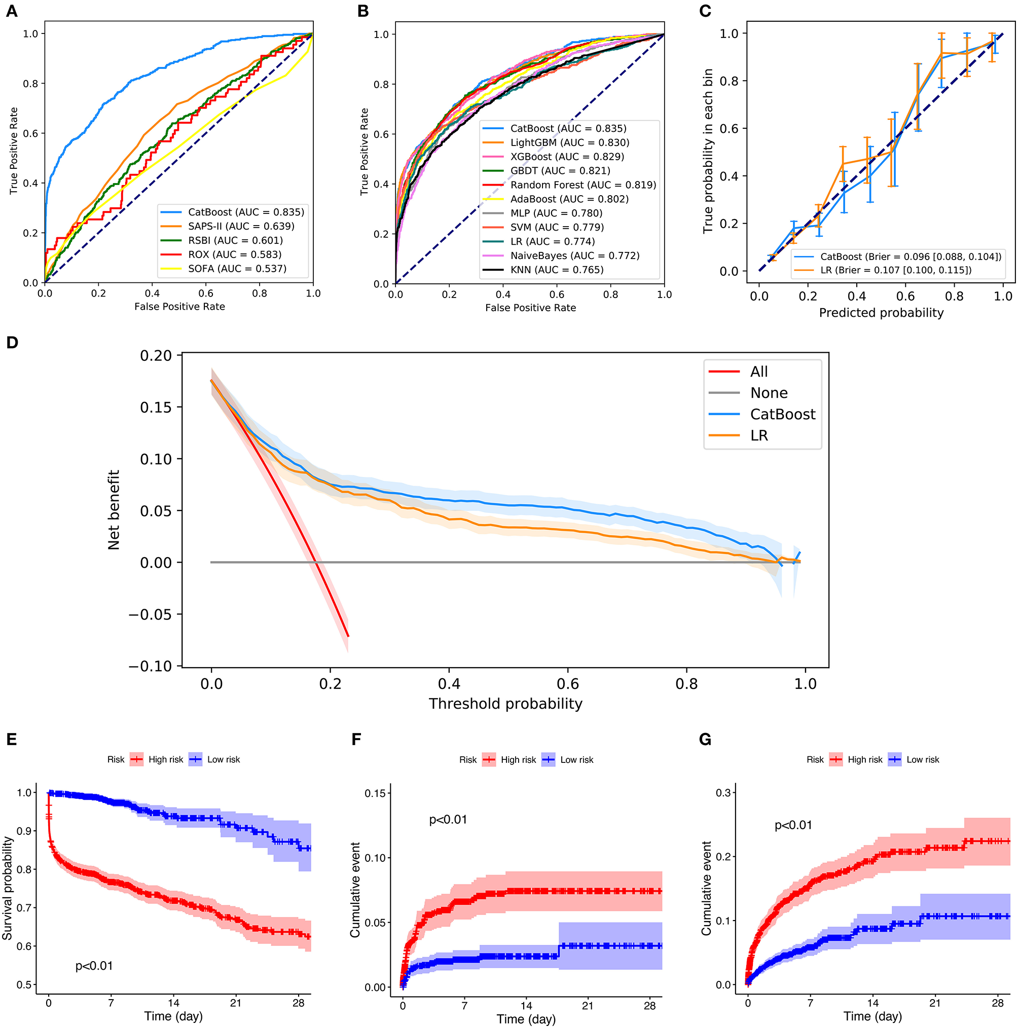 Comparison of model performance in the internal validation set. (A) Receiver operating characteristic curves (ROCs) of CatBoost and other predictive factors. (B) Receiver operating characteristic curves (ROCs) of different models. (C) Calibration plot of CatBoost model and Logistic Regression (LR). (D) Decision curve analysis of CatBoost and LR. (E) Kaplan Meier analysis of 28-day survival in the high- and low-risk groups; (F) Cumulative NIV events in the high- and low-risk groups; (G) Cumulative reintubation events in the high- and low-risk groups. AUC, area under the curve; RSBI, Rapid Shallow Breathing Index; SOFA, Sequential Organ Failure Assessment; SAPS-II, Simplified Acute Physiology Score-II; ROX, the ratio of pulse oximetry/fraction of inspired oxygen to respiratory rate; XGBOOST, eXtremely Gradient Boosting; GBDT, Gradient Boosting Decision Tree; KNN, K-Nearest Neighbor; SVM, Support Vector Machine; MLP, Multi-Layer Perceptron; LR, Logistic Regression; PPV, Positive Predictive Value; NPV, Negative Predictive Value.