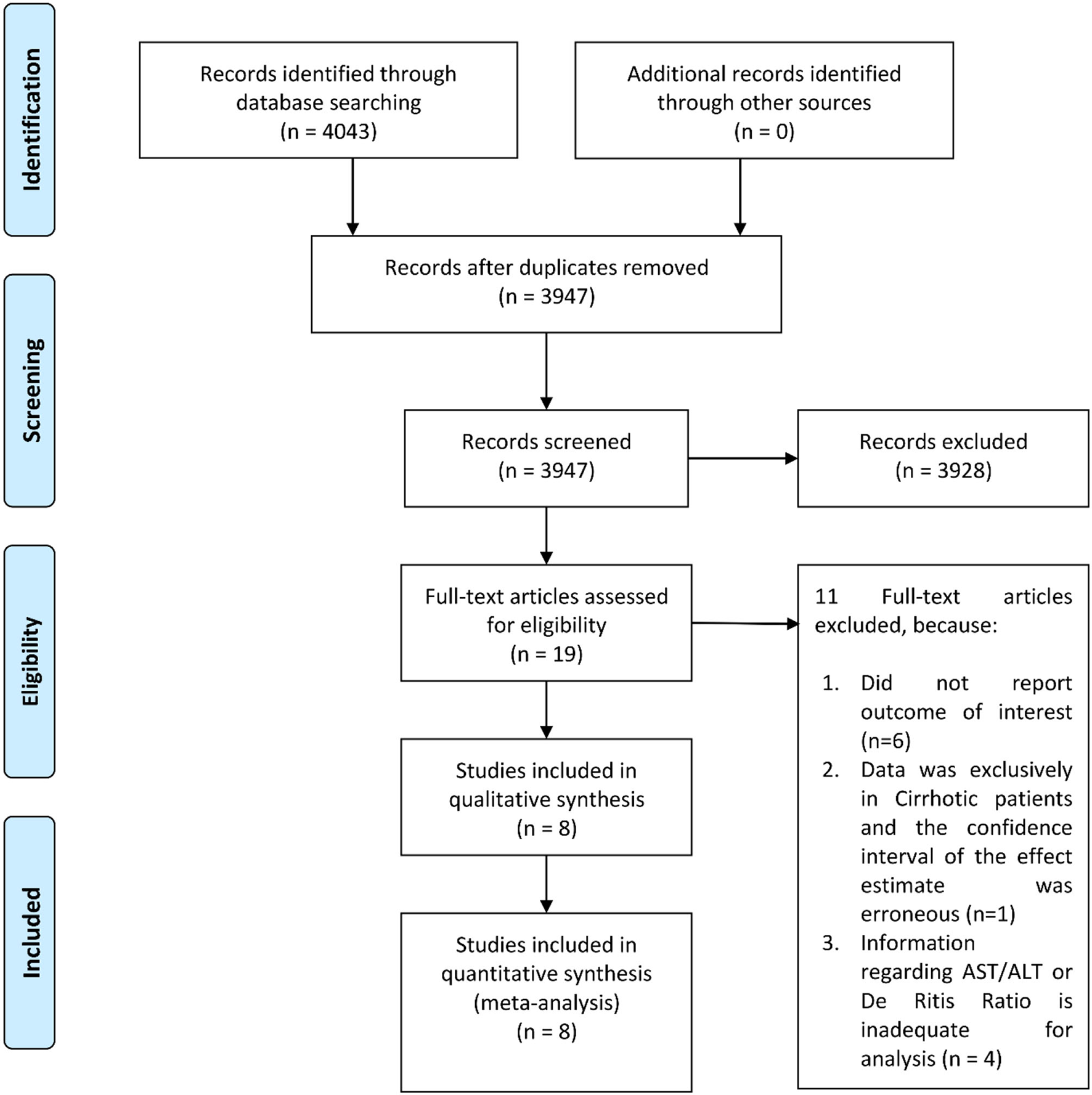 Data extraction from the eligible studies was conducted by two authors who are independently using pre-built forms containing the author, study design, origin, AST, ALT, cut-off for elevated De Ritis ratio, sample size, age, gender, obesity, diabetes, elevated liver enzymes, and outcome of interests.