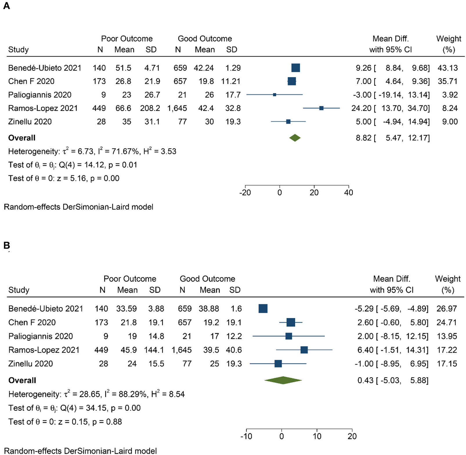 Figure 2. Mean difference in aspartate aminotransferase (AST) (A) and alanine transaminase (ALT) (B) level between poor and good prognosis.