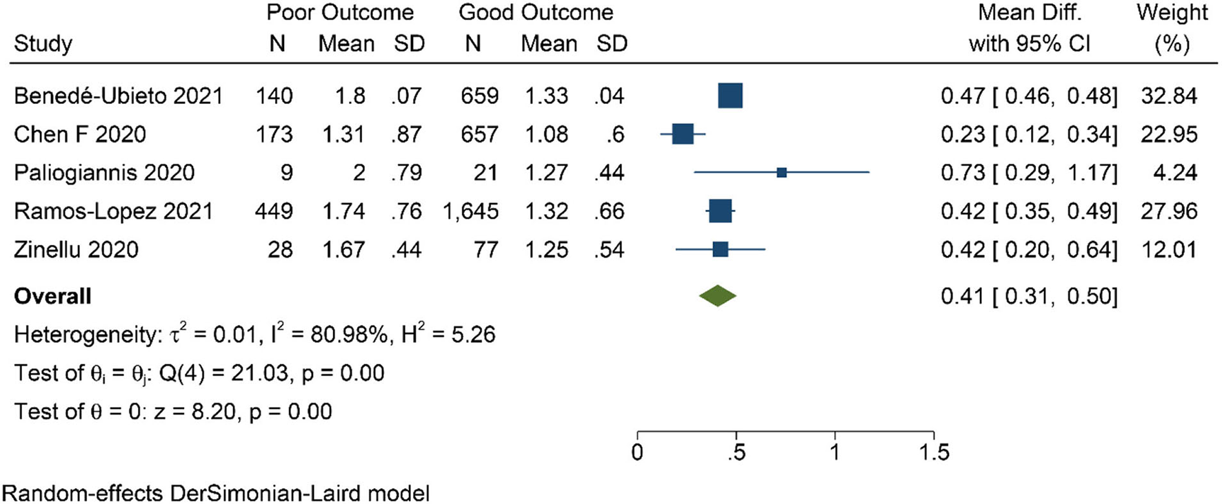 Results: There were eight studies with 4,606 patients. De Ritis ratio was elevated in 44% of the patients. Patients with poor prognosis have higher De Ritis ratio [mean difference 0.41 (0.31, 0.50), p < 0.001; I2: 81.0%] and subgroup analysis showed that non-survivors also have higher De Ritis Ratio [mean difference 0.47 (0.46, 0.48), p < 0.001; I2: 0%]. Elevated De Ritis ratio was associated with poor prognosis [OR 3.28 (2.39, 4.52), p < 0.001; I2: 35.8%]. It has a sensitivity of 55% (36–73), specificity of 71% (52–85), PLR 1.9, NLR.63, DOR of 3 (2–4), and AUC of.67 (0.63–0.71). The posterior probability of poor prognosis was 38% if De Ritis is elevated, while 17% if De Ritis is not elevated.