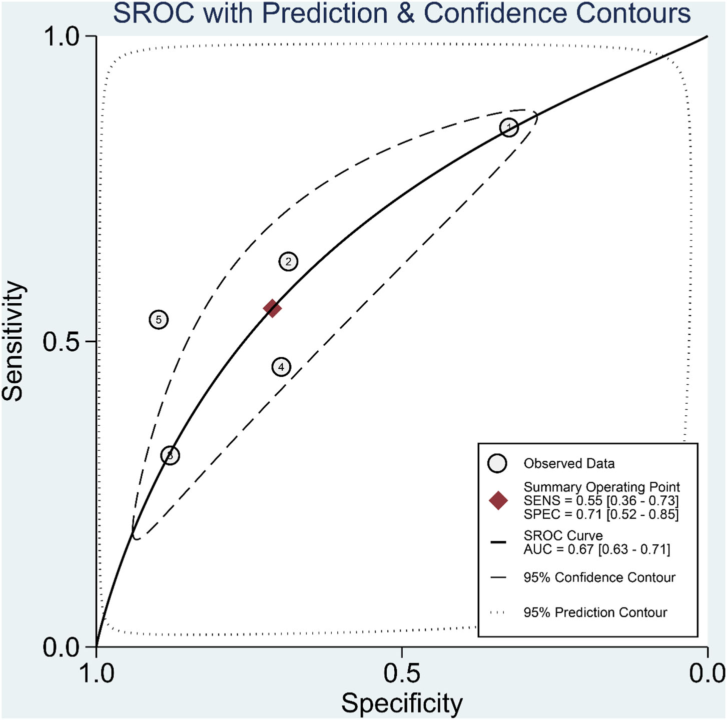 The De Ritis ratio or the AST/ALT ratio is a promising biochemical parameter for prognostication in COVID-19. In the present study, elevated De Ritis ratio was associated with 3-fold increased risk for poor prognosis in patients with COVID-19. Although the cut-off values for elevated De Ritis ratio are different from these five studies (Table 1), the result of this meta-analysis has low heterogeneity (I2: 35.8%). Nonetheless, the difference in the cut-off value used between those studies caused a highly varied diagnostic value (Figure 3) with an overall sensitivity of 55%, specificity of 71%, and AUC of 0.67. These variations further translate into the uncertainty of the optimal cut-off value for De Ritis Ratio as a prognostic factor in COVID-19 and merit further investigations.