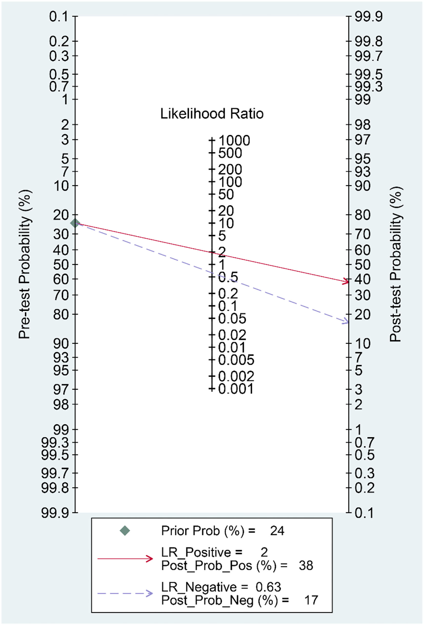 Patients with poor prognosis have higher De Ritis ratio [mean difference 0.41 (0.31, 0.50), p < 0.001; I2: 81.0%, p < 0.001] (Figure 3) and subgroup analysis showed that non-survivors also have higher De Ritis Ratio [mean difference 0.47 (0.46, 0.48), p < 0.001; I2: 0%, p = 0.463]. Elevated De Ritis ratio was associated with poor prognosis [OR 3.28 (2.39, 4.52), p < 0.001; I2: 35.8%, p = 0.182] (Figure 4) and subgroup analysis also showed that elevated De Ritis ratio was associated with mortality [OR 3.36 (1.93, 5.85), p < 0.001; I2: 51.7%, p = 0.102]. It has a sensitivity of 55% (36–73), specificity of 71% (52–85), PLR 1.9, NLR 0.63, DOR of 3 (2–4), and AUC of 0.67 (0.63–0.71) (Figure 5). The posterior probability of poor prognosis was 38% if De Ritis was elevated, while 17% if De Ritis was not elevated (Figure 6).