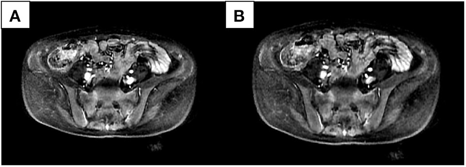 Female, 28 years old, chief complaint of lumbago for 21 months, exacerbation accompanied by generalized asthenia for 6 months. Erythrocyte sedimentation rate, C-reactive protein, and human leukocyte antigen-B27 were all negative. Alkaline phosphatase was 269.6 U/L; inorganic phosphorus was 0.43 mmol/L. Bilateral sacral bone marrow edema signals could be seen in two continuous layers (A,B) in the short-tau inversion recovery sequence.