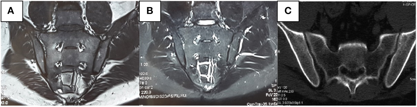 Male, 31 years old, bilateral hip pain for 8 months and lumbago for 2 months. C-reactive protein, rheumatoid factors, and human leukocyte antigen-B27 were all negative. Alkaline phosphatase was 346 U/L. Inorganic phosphorus was 0.48 mmol/L. No apparent abnormalities were observed in the sacroiliac joint (SIJ)–magnetic resonance imaging T1-weighted [T1W, (A)] and short-tau inversion recovery [STIR, (B)] sequences. It can be seen in the computerized tomography that the left SIJ is coarse rather than smooth (C).