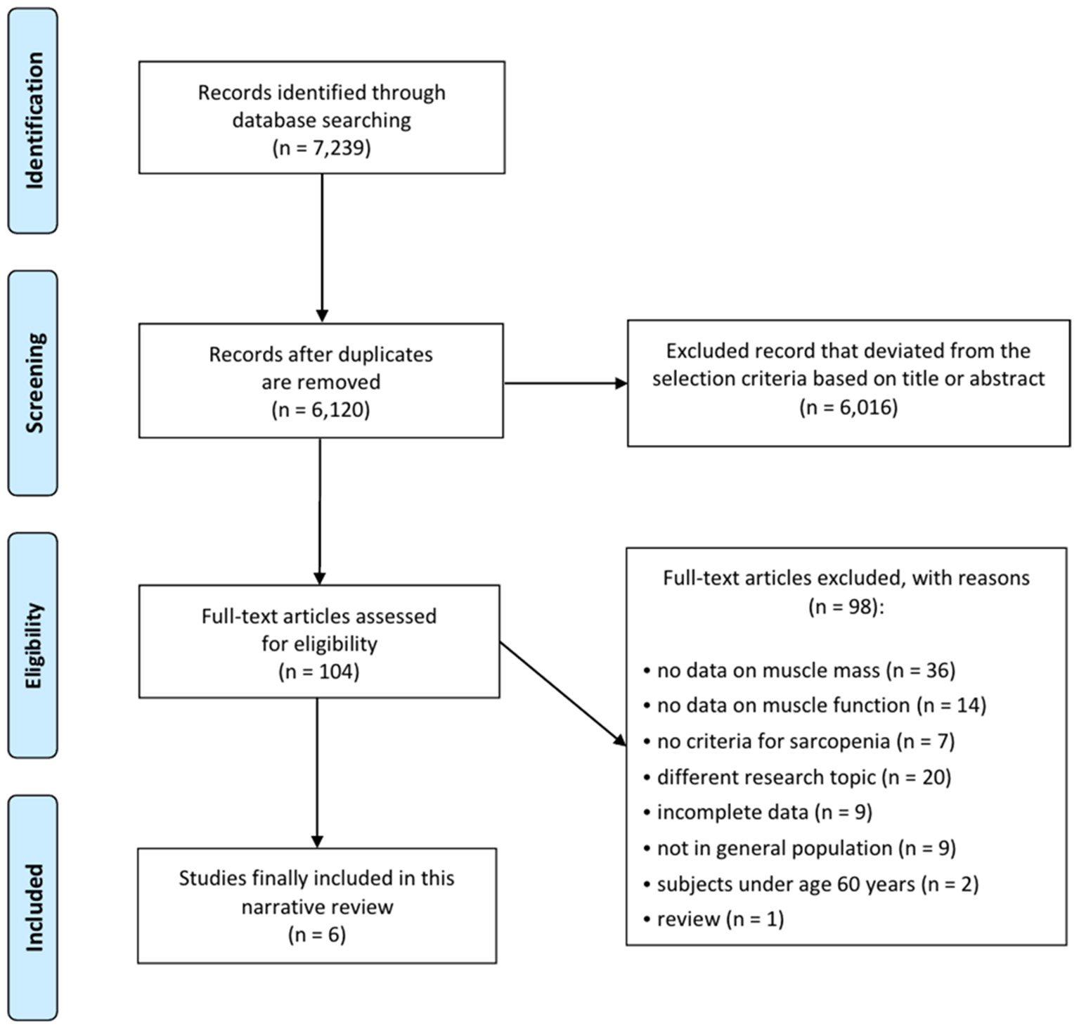 A total of 7,239 potentially relevant studies were selected for the preliminary search from all databases (Figure 1). We initially excluded 1,119 duplicate studies, and excluded an additional 6,016 publications after reviewing their titles and abstracts. The remaining studies were assessed through a full text review of the articles. The European Working Group on Sarcopenia (EWGS) and Asian Working Group for Sarcopenia (AWGS) were considered as the standard criteria for the diagnosis of sarcopenia (6, 7). After the systematic review, six articles were included (Table 1) (19–24). In all six articles, the AWGS criteria were used to diagnose sarcopenia (7).