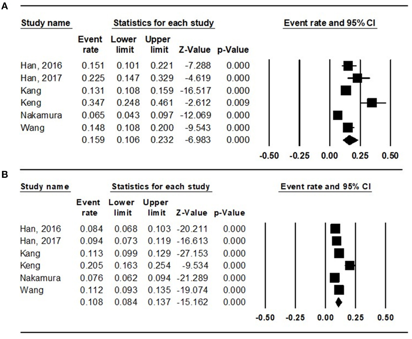Results of the meta-analysis on sarcopenia prevalence among the (A) diabetes population and that among the (B) non-diabetes population.