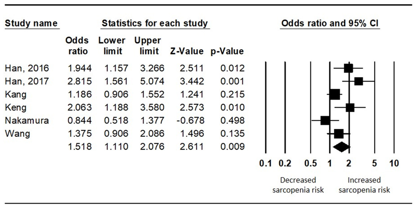 Results: Six articles were included in the systematic review. All the patients were Asian, aged ≥60 years (women 53.4%), and the diabetic and non-diabetic population was 1,537 and 5,485, respectively. In all six studies, the Asian Working Group for Sarcopenia criteria were used to diagnose sarcopenia. The prevalence of sarcopenia was 15.9% in diabetics and 10.8% in non-diabetics. Diabetics showed a significantly higher risk of sarcopenia than non-diabetics (pooled OR = 1.518, 95% CI = 1.110 to 2.076, Z-value = 2.611, p = 0.009).
