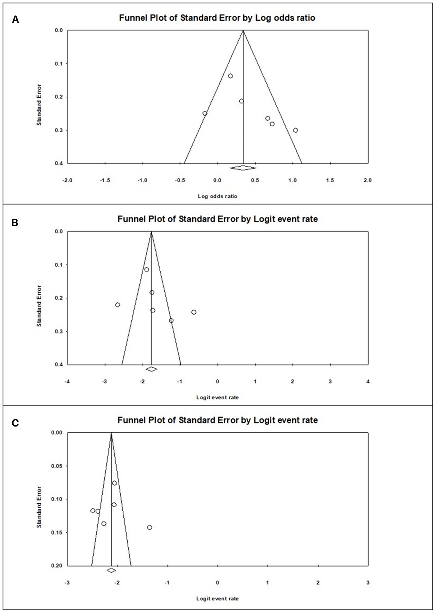 Graphic funnel plots of the included studies (A), diabetes population vs. non-diabetic population; (B), prevalence of sarcopenia among the diabetes population; (C), prevalence of sarcopenia among the non-diabetic population.