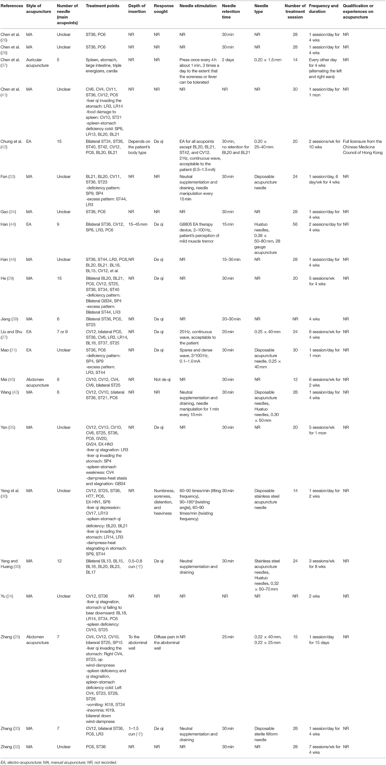 Except for one trial (39) which set the main acupoints according to pattern identification, a total of 36 acupoints were used as the main acupoints in 22 trials. Among them, ST36 was used the most in 18 trials, followed by PC6 (16 trials), CV12 (13 trials), ST25 (six trials), BL20 (five trials), and LR3 (five trials). As a response to acupuncture, 13 trials acquired De qi, such as numbness, soreness, distention, and heaviness. In the study that used electroacupuncture, the frequency was varied from 2 to 100 Hz, and the intensity was performed to the extent that the participants could tolerate it. Continuous waves were used as the waveform in two trials (31, 42) and sparse and dense waves were used in one trial (40). The needle retention time was between 15 and 30 min, with 30 min the most commonly used (14 trials). The duration of treatment varied from 2 to 10 weeks, with 4 weeks the most common. The number of treatment sessions varied from 12 to 56, with 28 sessions being the most common (7 trials). In one trial (42) a full license from the Chinese Medicine Council of Hong Kong was presented as a qualification for acupuncture therapists (Table 2).