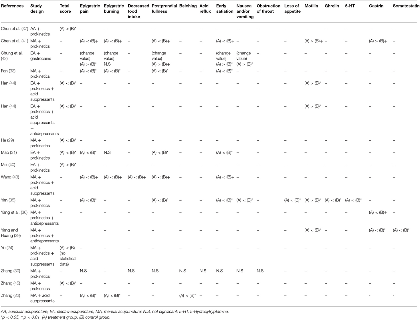 A meta-analysis was not performed because of the heterogeneity of the symptom score scales used in the included studies. The results of each study are summarized in Table 3. In addition to the total score, ten individual symptoms including epigastric pain, epigastric burning, decreased food intake, postprandial fullness, belching, acid reflux, early satiation, nausea and/or vomiting, obstruction of the throat, and loss of appetite were evaluated. In one study that compared manual acupuncture combined with mosapride and mosapride alone, it was found that there was no significant difference in the symptom scores between the two groups (30). One study found that the total symptom score of manual acupuncture combined with domperidone and sucralfate was higher than the control group. However, they did not statistically analyze the score (24). All other studies found that the individual symptoms of FD were significantly improved in the acupuncture combined with the WM group compared to the WM alone group (29, 31–33, 35–37, 39–45).