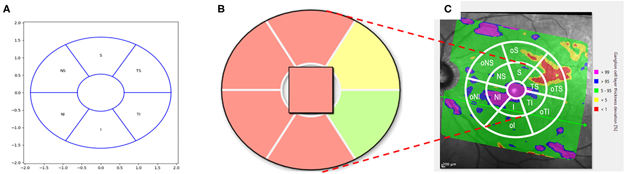 Schematic scetch of the conventional macular grid (A) with color coding (B) and extended version (C). (A) Conventional Macular Grid: The macular grid was defined by an elliptical ring: the inner radius was 0.618 mm in the horizontal axis and the inner radius of the vertical axis was 0.531 mm. The outer radius of the elliptical ring was 1.857 mm horizontally and 1.590 mm vertically. The elliptical ring was divided into 6 sectors with angles of 60°. These 6 sectors of the macular grid corresponded to the superior (S), inferior (I), temporal-superior (TS), temporal-inferior (TI), nasal-superior (NS), and nasal-inferior (NI) macular region. (B) Macular Grid color-coding: The sectors of the macular grid were color-coded according to percentiles: A sector is marked with green if the thickness of the RGCL in this sector is >5th percentile of a healthy reference population. If a sector is colored yellow, the value of the average RGCL thickness < 5th percentile, yet > 1st percentile of the reference database. A red colored sector represented data which were < 1st percentile. In the qualitative analysis, a green sector was counted with one point, a yellow sector with 2 and a red sector with 3 points. (C) Extended Macular Grid: An enlarged elliptical ring was added to the pre-existing macular grid (extended macular grid): 3.714 mm horizontally and 3.18 mm vertically (i.e., doubled outer radii of the conventional macular grid, respectively). This resulted in 6 new outer sectors (o). The outer sectors were called outer superior (oS), outer inferior (oI), outer temporal-superior (oTS), outer temporal-inferior (oTI), outer nasal-superior (oNS), and outer nasal-inferior (oNI).