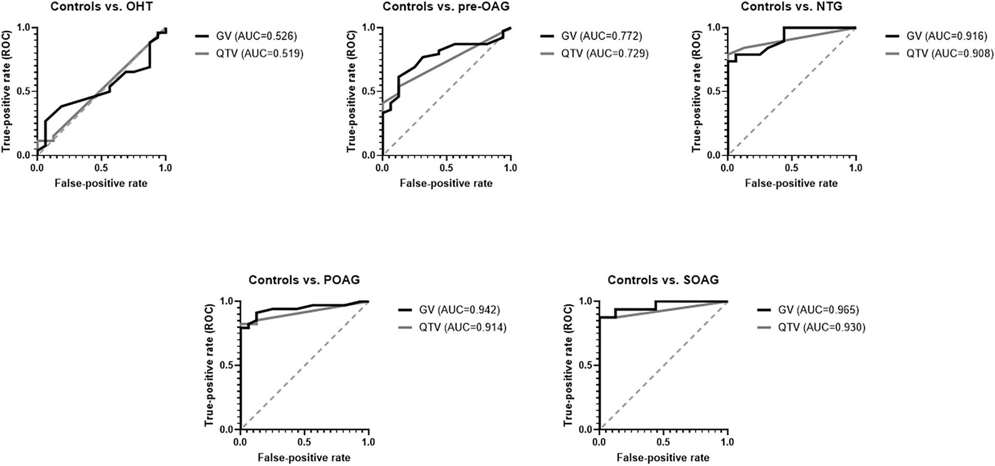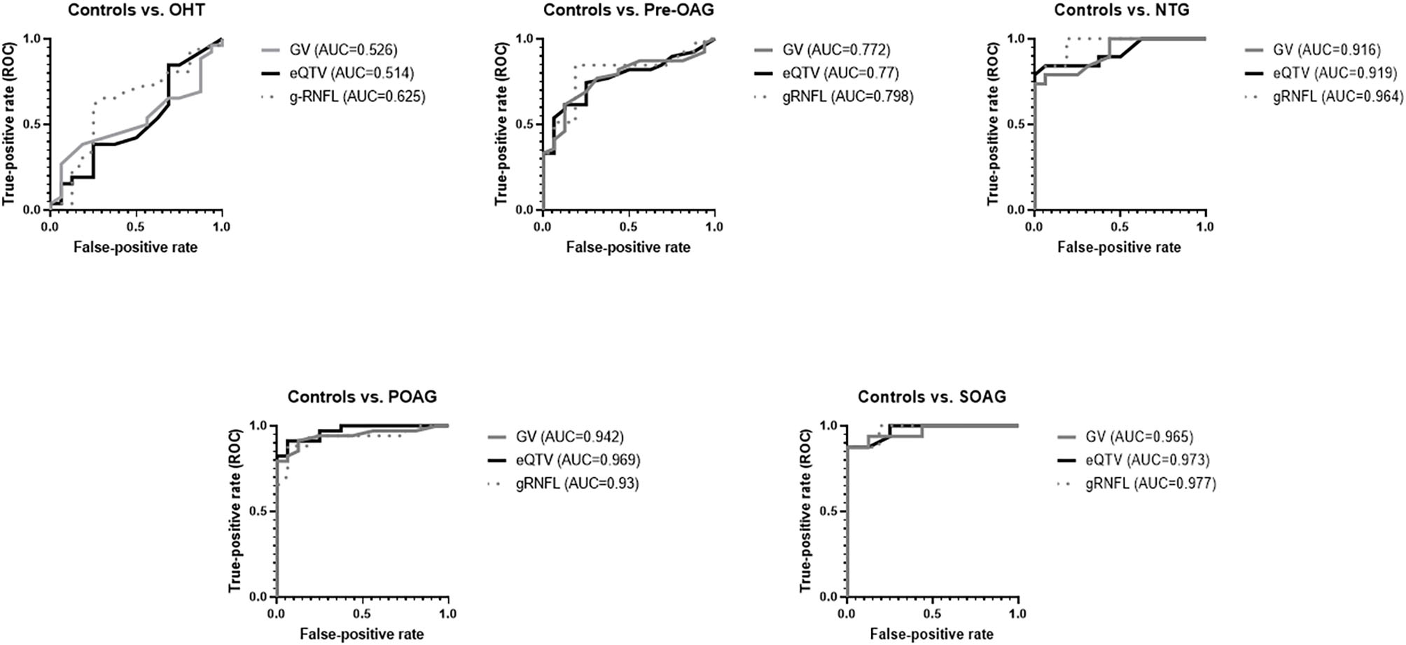 Results: GV of RGCL thickness differed significantly between pre-OAG (p < 0.05), NTG (p < 0.001), POAG (p < 0.001), SOAG (p < 0.001), yet not OHT (p > 0.05) and controls, respectively. Quantitative ROC analysis of GV showed AUC of 0.965 (SOAG), 0.942 (POAG), 0.916 (NTG), 0.772 (pre-OAG), and 0.526 (OHT). QTV differed significantly between pre-POAG (p < 0.05), NTG (p < 0.001), POAG (p < 0.001), SOAG (p < 0.001), yet not OHT (p > 0.05) and controls, respectively. Qualitative ROC analysis of QTV showed AUCs of 0.908 (NTG) 0.914 (POAG), 0.930 (SOAG), 0.734 (pre-POAG), and 0.519 (OHT). Implementation of eQTV yielded even higher AUCs for NTG (0.919), POAG (0.969), and SOAG (0.973) compared to GV. Similar AUCs of eQTV and GV were observed for OHT (0.514) and pre-OAG (0.770).