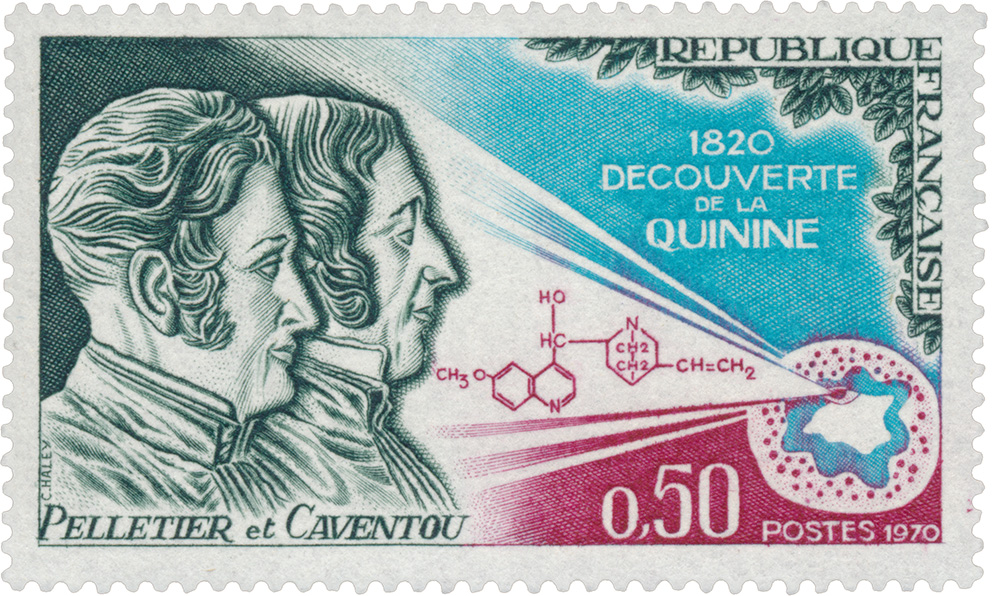Postage stamp edited in 1970 with the images of Pelletier and Caventou, who first isolated the active ingredient “quinine”.
