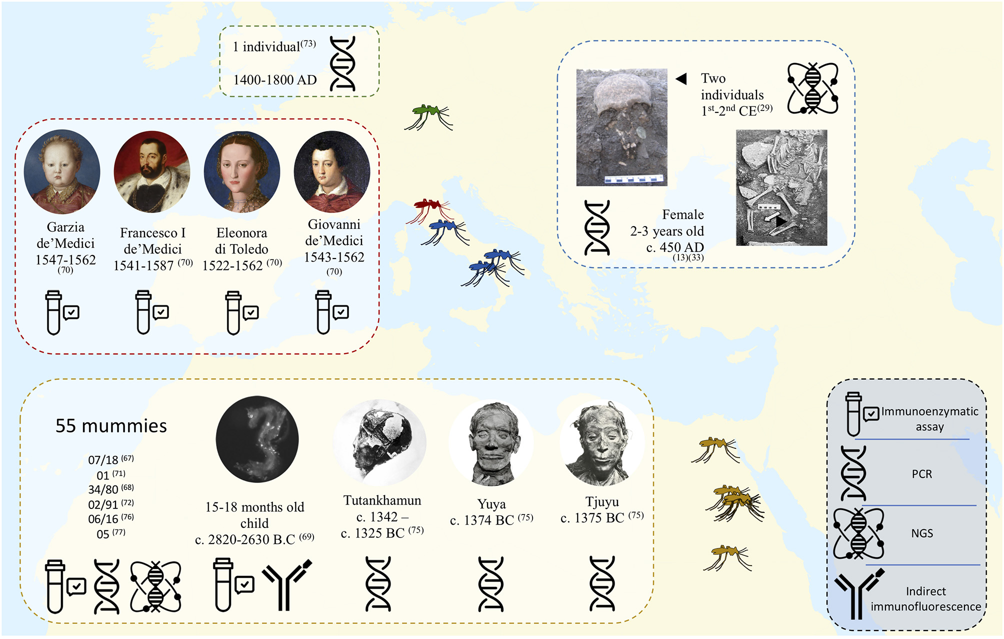 An initial paleomicrobiological study detected the P. falciparum histidine-rich protein-2 antigen (PfHRP-2) in seven Egyptian mummies from different periods, ranging from 3200 BC to 350–500 AD (67). Likewise, by using PfHRP-2 assay, P. falciparum. was detected in 30/71 (42%) of mummies from 3200 BC preserved in the Anthropological and Ethnographic Museum of Turin, with the same magnitude of malaria prevalence in endemic regions (68). An immunochromatographic and immunohistochemical study performed in 2008 by Bianucci et al. on muscle and skin samples collected from an Egyptian mummified child aged 15–18 months yielded positive detection of P. falciparum histidine-rich protein-2. Moreover, the muscle sample yielded positive results for the MSP1-19 antigen common to the genus Plasmodium (69). In Italy, studies based on immunological tests on bone samples from the Medici family of Florence, dating from the 16th century, detected proteins of P. falciparum in four members of the family (70). Also, an immunological study targeting the P. falciparum highly specific HRP-II protein on 34 individuals dating from 14th BC to the 16th century, in Sardinia indicated that malaria may date back to the Carthaginian period (502 B-C) (14).