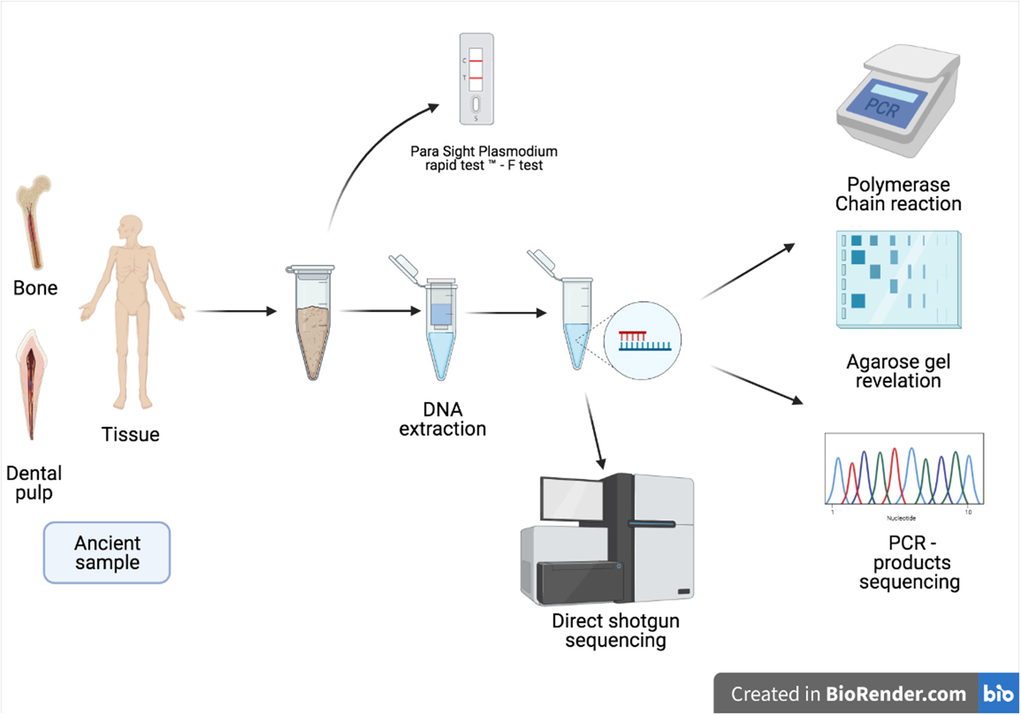 Schematic presentation of the techniques used in the diagnosis of malaria in ancient samples.