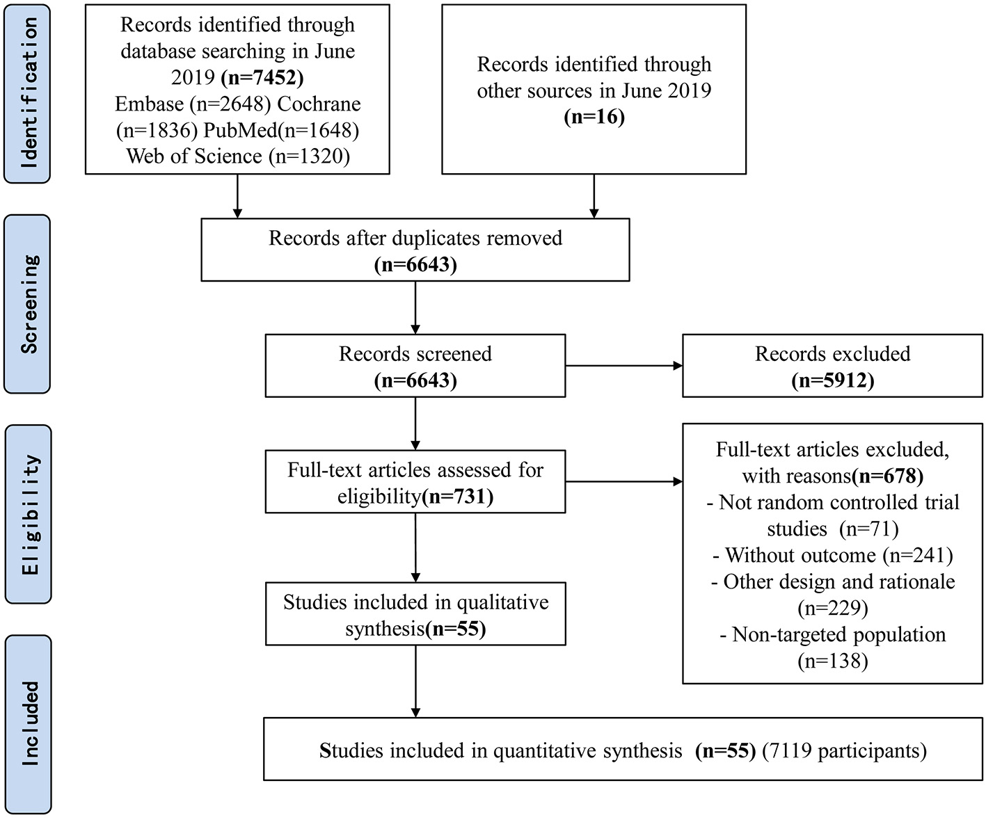 We conducted a systematic literature search for clinical trials in Pubmed, Embase, Cochrane (CENTRAL) and Web of Science electronic medical databases until June 30, 2019. There was no language restriction. The specific search terms were used for each database, and the details of the search strategy were modified with a combination of relevant terms as proposed by Cochrane for systematic reviews of RCTs (45). The following MeSH terms were used to search for relevant literature: “critically ill” OR “synbiotic” OR “probiotic” OR “prebiotic” OR “enteral nutrition” OR “parenteral nutrition” OR “nosocomial infection” combined with RCTs.