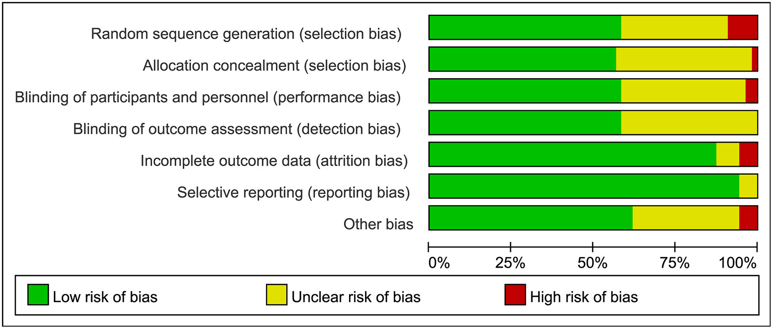 We assessed each included studies' ROB in accordance with the Cochrane collaboration risk of bias tool (45). A summary of the ROB was documented as low, unclear or high. Studies were classified as having low ROB if none was rated as high ROB, and three or less were rated as unclear risk. Studies had moderate ROB if one was rated as high ROB or none was rated as high ROB but four or more were rated as unclear risk. All other cases were assumed to pertain to high ROB.