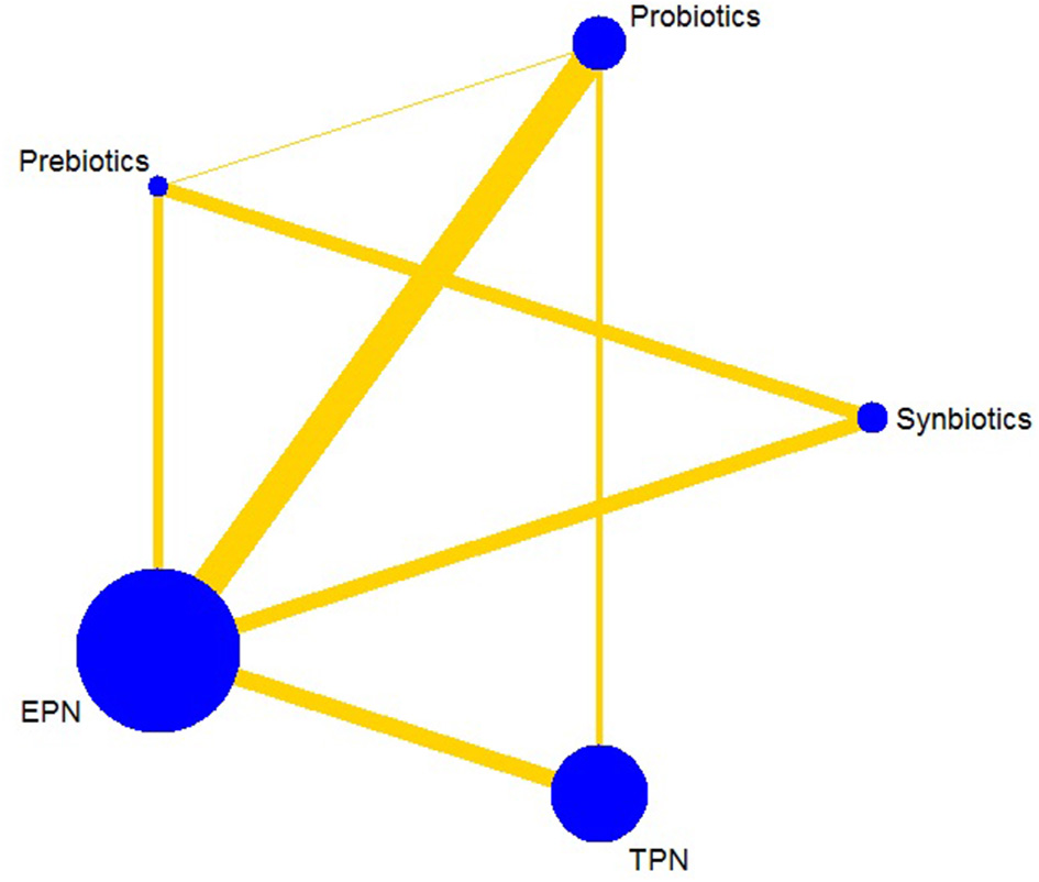 Results: Fifty-five RCTs (7,119 patients) were identified. Primary outcome showed that synbiotics had the best effect in preventing NI than EPN (OR 0.37; 95% CrI 0.22–0.61), probiotics followed (OR 0.52; 95% CrI 0.34–0.77), whereas TPN significantly increased NI (OR 2.29; 95% CrI 1.48–3.67). Subgroup analysis showed that TPN significantly increased NI in intensive care unit (ICU) patients (OR 1.57; 95% CrI 1.01–2.56) and severe acute pancreatitis (SAP) patients (OR 3.93; 95% CrI 1.74–9.15). Secondary outcomes showed that synbiotics were more effective in preventing hospital-acquired pneumonia (HAP) (OR 0.34; 95% CrI 0.11–0.85), catheter-related bloodstream infection (OR 0.08; 95% CrI 0.01–0.80), urinary tract infection (OR 0.27; 95% CrI 0.08–0.71) and sepsis (OR 0.34; 95% CrI 0.16–0.70) than EPN. Amongst the treatments, probiotics were most effective for shortening the mechanical ventilation duration (MD −3.93; 95% CrI −7.98 to −0.02), prebiotics were most effective for preventing diarrhea (OR 0.24; 95% CrI 0.05–0.94) and TPN was the least effective in shortening hospital length of stay (MD 4.23; 95% CrI 0.97–7.33).