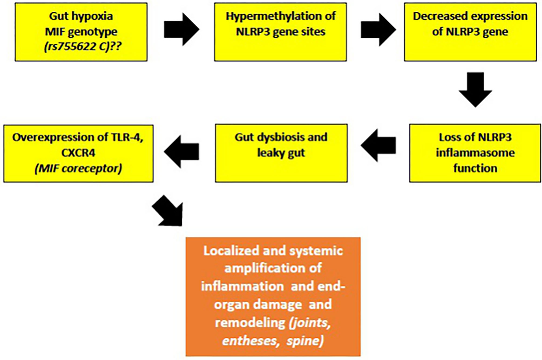 I further speculate that hypermethylation of NLRP3 can be promoted by certain MIF genotypes, based on similar association of MIF rs755622C allele with hypermethylation of tumor suppressors p14ARF and p16INK4a, both encoded by Cyclin Dependent Kinase Inhibitor 2A (CDKN2A). Hypermethylation of both p14ARF and p16INK4a was found in normal colonic mucosal tissues of patients with UC, as well in the precancerous lesions, suggesting that UC patients with this particular inflammatory genotype of MIF may be at a higher risk for developing colonic cancer (128). This rs755622C genotype association was also observed in patients with IBD and in Chinese patients with psoriasis, but not in Turkish patients with AS (97, 98, 129). Despite that, the authors have suggested that the time of onset and the duration of AS still might be affected by rs755622C allele (129). However, this hypothesis still needs to be proven in the laboratory, along with testing for MIF-rs755622C allele in more patients with early-onset jSpA. In summary, the downregulated NLRP3 gene in patients with early jSpA/ErA might reflect the occurrence of a subclinical inflammation of the gut mucosa (“low-grade IBD”), leading to a leaky gut (Figure 2).