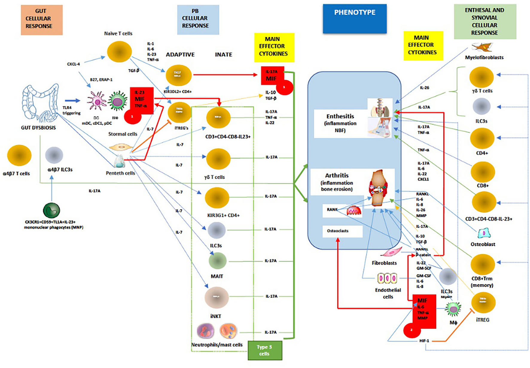 The immunopathogenesis of SpA, with the complex interactions of cellular and main effector cytokine network mediated by MIF, are displayed in Figure 3.