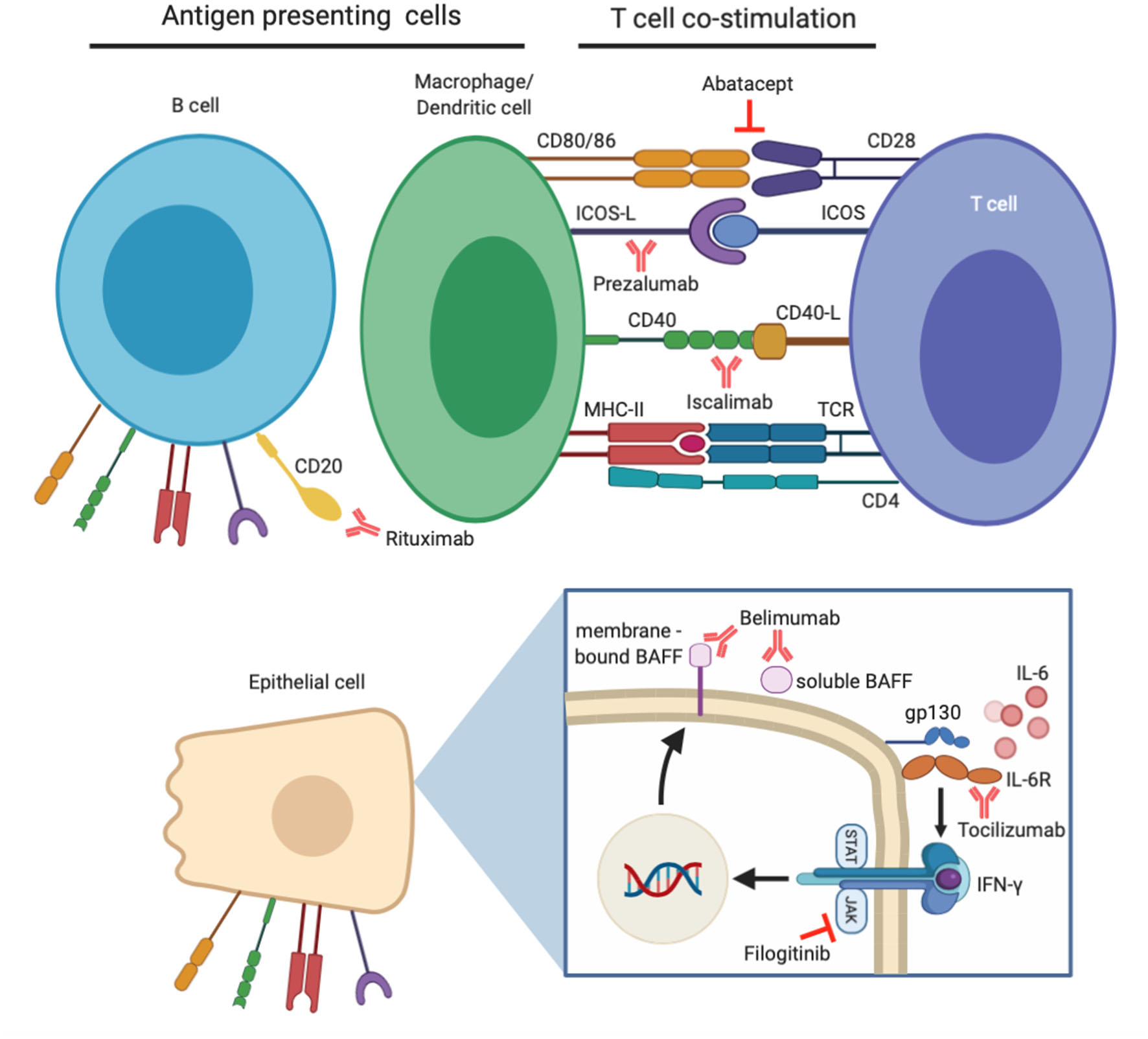 Demonstration of biological therapies clinically evaluated for the treatment of primary Sjögren's syndrome (pSS) and their target molecules. B-cell hyperactivity is a major contributor to pSS pathogenesis, and their numbers can be depleted by anti-CD20 antibody rituximab. B-cells alongside other professional (macrophages/dendritic cells) and non-professional (epithelial) antigen presenting cells are involved in enhanced T-cell co-stimulation in pSS. Specific co-stimulatory pathways can be inhibited by abatacept, prezalumab, and iscalimab. Pro-inflammatory effects of cytokine IL-6 can be prevented by tocilizumab therapy, whilst effects of IFN-γ can be mitigated by inhibition of the JAK/STAT pathway. An additional downstream effect of this is prevention of BAFF expression, which can itself be targeted by belimumab therapy.