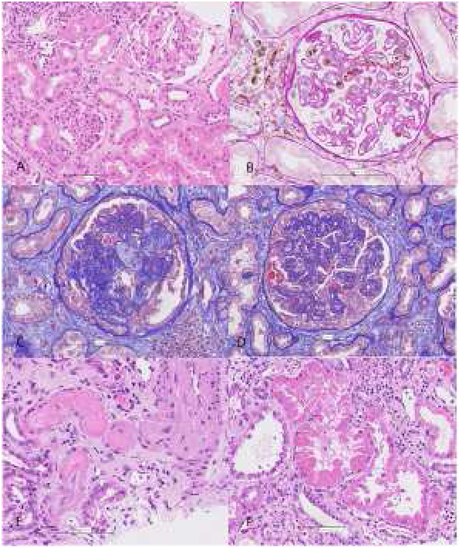 Figure 1. Before application of MSCs (March 2019): chronic active C4d negative antibody-mediated rejection with preserved tubules (A), focal glomerulitis and peritubular capillaritis (B). According to Banff 2017 criteria, transplant kidney biopsy was consistent with chronic active C4d negative antibody mediated rejection: 12% glomerulitis with double contour formation (g1, cg3) in glomeruli, diffuse severe peritubular capillaritis (ptc3), chronic active vascular rejection (v1, cv3) in interlobular arteries without signs of thrombotic microangiopathy, diffuse more than 50% interstitial fibrosis and tubular atrophy with mild mononuclear cell inflammation consisting of lymphocytes, macrophages, and rare plasma cells (i-IFTA 3, ci3, ct3). There was no associated tubulitis. Peritubular capillary basement membrane multilamellation (ptcbm3) was seen by electron microscopy. There were no deposits in tubular basement membrane. Immunofluorescence revealed IgA deposits indicating IgA nephropathy recurrence. 60% of glomeruli were globally sclerotic. 1 of 25 glomeruli showed pseudocrescent formation without PAS positive droplets in podocytes. After application of MSCs (July 2019): glomerular TMA with mesangiolysis (C), diffuse pseudocrescent formation in glomeruli with marked podocytes injury (D), vascular TMA (E) and huge tubular injury with resorptive droplets consisted with mottled lysosomes on EM (F). Glomeruli showed advanced double contour formation and segmental sclerosis without apparent glomerulitis, but mesangiolysis was seen in some glomeruli. 20% of glomeruli showed pseudocrescent formation with PAS positive droplets “in podocytes indicating huge podocytes injury”. Peritubular capillaritis was mild and focal. Tubulitis was absent. Tubules show signs of severe tubular injury (attenuation of tubular epithelium with coarse vacuolization, loss of brush border, loss of nuclei) and were filled with large PAS-positive droplets in line mottled lysosomes on electron microscopy. Electron optic dense deposits in tubular basement membrane were detected by EM. Amount of interstitial fibrosis, tubular atrophy, and interstitial inflammation was similar as in previous biopsy. In fibrotic areas, there was mild mononuclear cell inflammation consisting of lymphocytes 75%, macrophages 15%, and plasma cells 10%. No CD105+, CD73+ nor CD90+ cells were found. In small arteries and arterioles, thrombotic microangiopathy with obliteration of vascular lumens, fragmentation of erythrocytes, and fibrinoid necrosis was present. Peritubular capillary basement membrane multilamellation (ptcbm3) was similar as in previous biopsy.