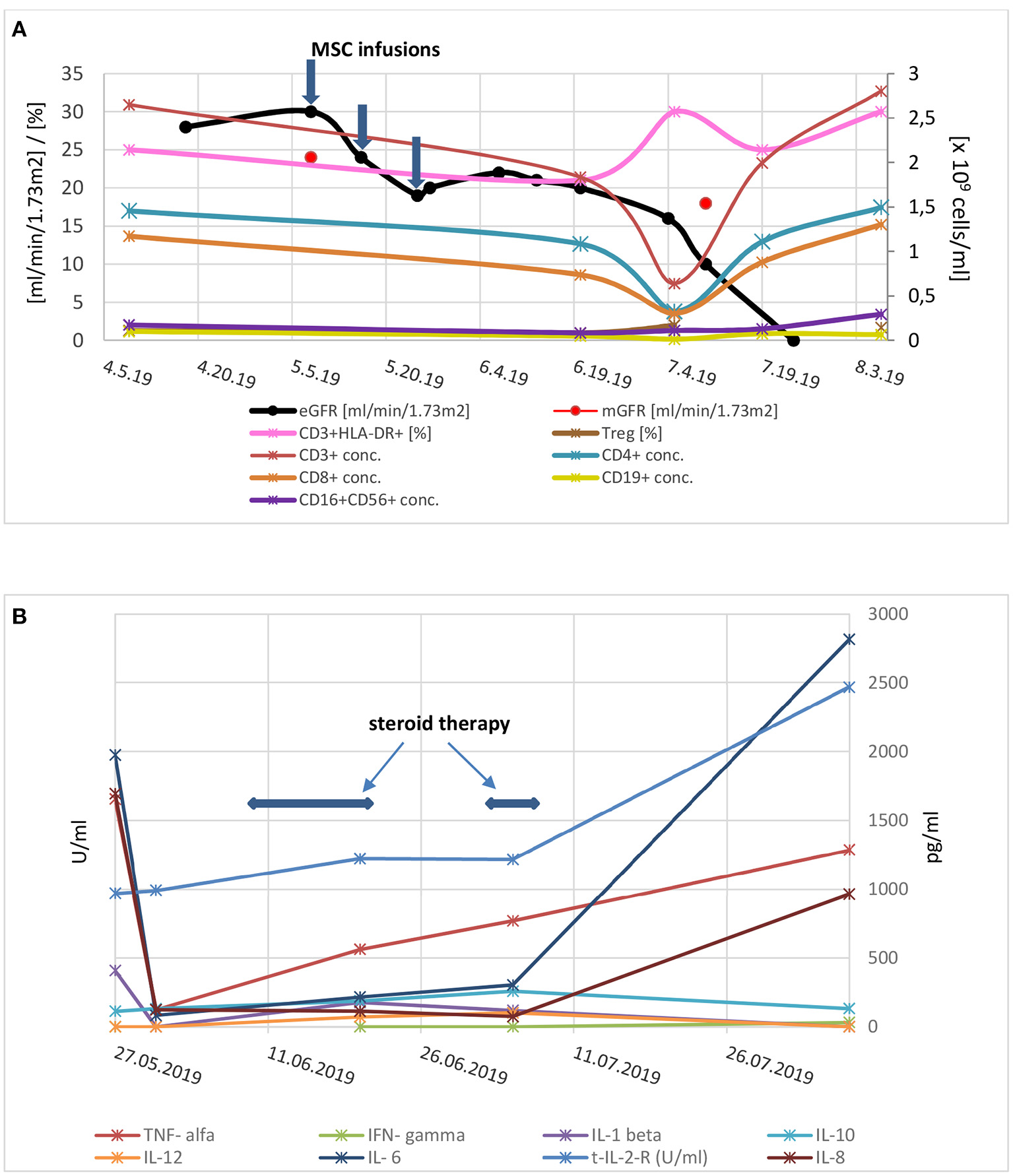 Figure 2. (A) Kidney graft function and serum concentrations of lymphocyte populations before and after application of mesenchymal stem cells. Three consecutive applications of mesenchymal stem cells are marked with arrows. eGFR, estimated glomerular filtration rate; mGFR, measured glomerular filtration rate (by Cr-EDTA); conc, concentration; Treg, regulatory T cells. (B) Cytokine concentrations after mesenchymal stem cells application (in U/mL for soluble interleukin 2 receptor and in pg/mL for other cytokines). Time frame of corticosteroid treatment is marked with arrows; Legend: TNF, tumor necrosis factor; IL, interleukin; s-IL-2-R, soluble interleukin 2 receptor; IFN, interferon.