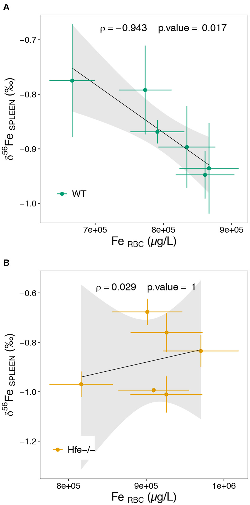 Scatterplot of the spleen Fe isotope composition as a function of the erythrocytes Fe concentration for the WT (A) and Hfe-/- (B) mouse groups. RBC stands for erythrocytes. The ρ coefficient and P-values of the Spearman test with associated significance (***P < 0.001, **P < 0.01, *P < 0.05) are given.