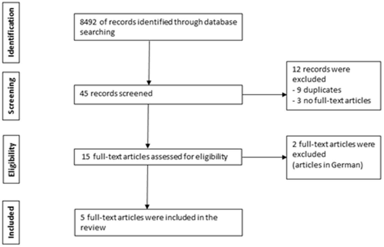 We conducted a systematic review of relevant literature articles in accordance with the Preferred Reporting Items for Systematic Reviews and Meta-analysis (PRISMA) guidelines (17). Several electronic databases (PubMed, ScienceDirect, Cochrane Library, and Web of Science databases) were searched to identify English language articles up to 29 February 2020 on costs associated with myopia correction treatment. The search used the keywords “myopia,” “short-sightedness” or “near-sightedness” combined with “cost” or “economic burden.” Original full-text articles in English were included if costs were quantified in relation to myopia correction, including: myopia correction (spectacles, contact lenses, refractive surgeries). 8,492 titles were retrieved through database searching. Forty five relevant records were reviewed with 12 records excluded (9 duplicates and 3 with no full-text available). Fifteen full-text articles were assessed for eligibility with 2 non-English articles excluded (articles in German). Articles that did not fulfill the inclusion criteria were excluded. Five eligible full-text articles were included in this review (18–22). The review article selection process is illustrated as a flowchart in Figure 1. The Asian studies comprised of 2 from Singapore while the non-Asian studies comprised of one from each of the following countries: United States of America (USA), Iran and Spain.