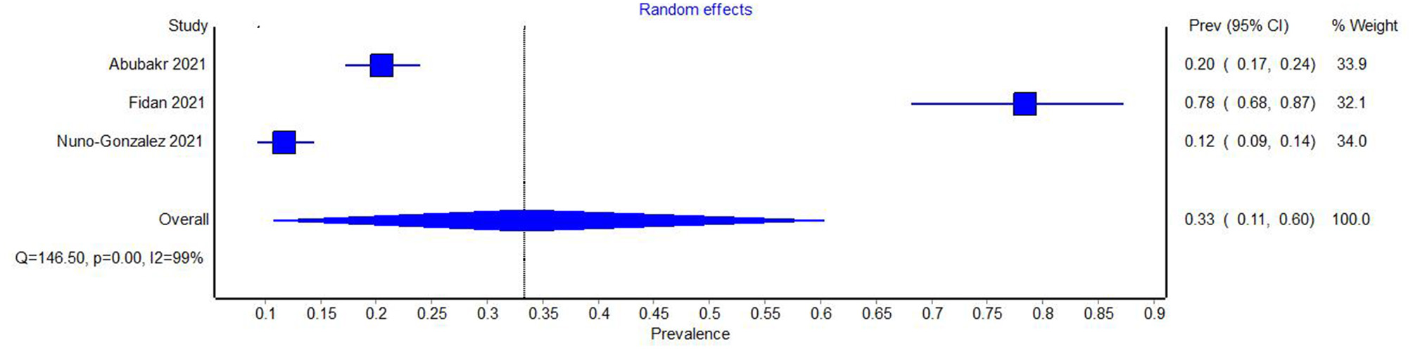 On the other hand, the included studies report on the prevalence of oral manifestations of COVID-19 in three categories: oral manifestations in general, xerostomia, and aphthous lesions. In the studies concerning the prevalence of oral lesions in general and aphthous lesions, tests showed a very high degree of heterogeneity- I2 = 99% for oral lesions in general and I2 = 98% for aphthous lesions. The meta-analysis of prevalence yielded a prevalence of 0.33 (95% CI 0.11–0.60) for oral lesions in general and 0.10 (95% CI = 0.01–0.24) for aphthous lesions.