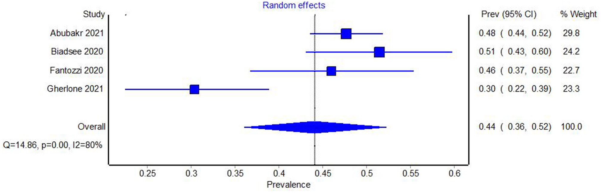 Forest plot showing the pooled prevalence of xerostomia in COVID-19.