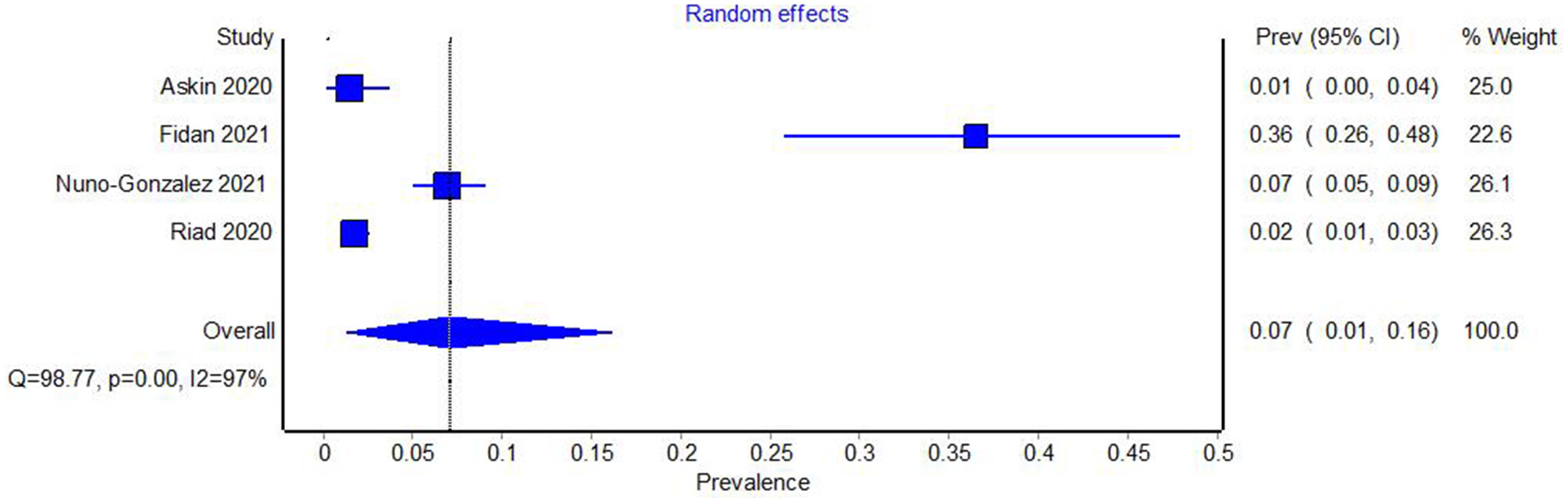 The study with a high risk of bias was eliminated from the analysis and the heterogeneity tests and meta-analysis were repeated. Again, high heterogeneity between studies was evident (Q = 95.22, p = 0.00. I2 = 98%). The prevalence of aphthous lesions in COVID-19 was 0.10 (95% CI = 0.01–0.24) (Figure 5).