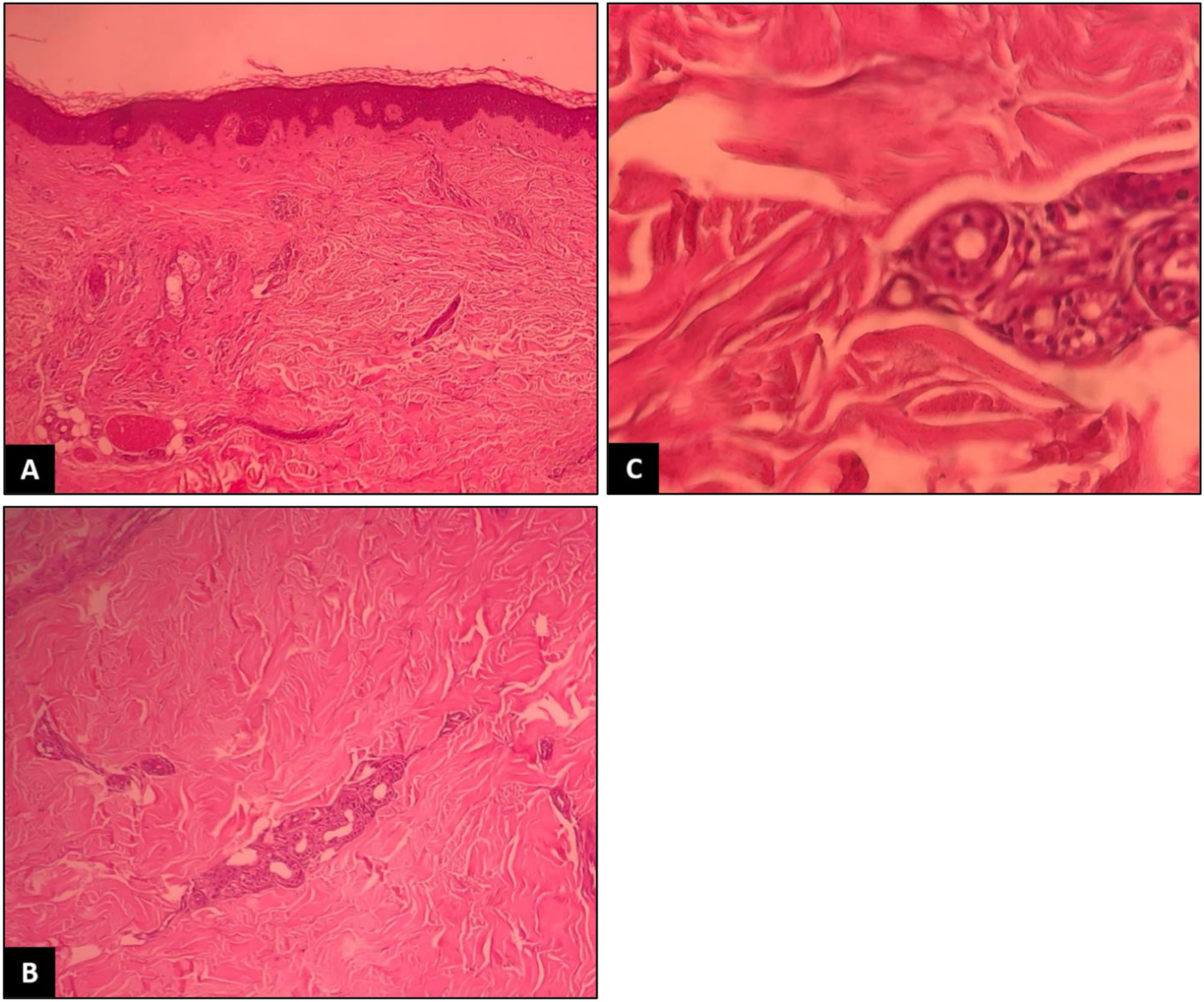Thickening and hyalinization of connective tissue of deep dermis, subcutaneous fat and muscular fascia, and mucin deposition (A). Atrophy of adnexal structures, increased fibroblastsand dense collagens through the deep dermis (B). Infiltrative changes in the eccrine glands (C). No obvious eosinophilic infiltration was detected.