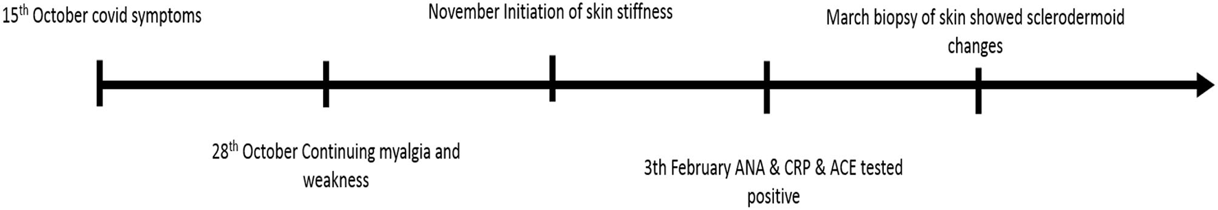 The rheumatologist ordered the tests again, which revealed ACE to be higher than the normal range while ANA and anti-ds DNA were negative. Physical examination revealed taut skin and subcutaneous tissue of the left upper limb, in addition to arthritis and arthralgia, so the patient was referred to the dermatology department for a scleroderma work-up. Changes in favor of scleroderma morphea were observed in the first visit of the patient to the dermatology clinic. Physical examination revealed the skin had turned shiny and tight (Figure 1). When touched, the skin felt rather sclerotic and lost the ability to fold compared with normal skin. Severe sclerosis was observed in both pretibial regions. In addition to changes in the arm and lower abdomen in favor of morphea, clinically deep morphea could not be differentiated from eosinophilic fasciitis. Therefore, a deep biopsy was performed on the left pre-tibial and left arm regions which showed changes in favor of sclerodermoid changes and no sign of eosinophilic fasciitis (Figure 2). Re-examination 2 weeks later revealed the exacerbation of previous lesions, newly formed lesions that rapidly spread to the proximal lower limbs and distal upper limbs, and difficult and painful movement of the limb. The pathology report corresponded to scleroderma/morphea in both regions. Treatment initiated with corticosteroids and the patient underwent further examinations while the case report was being written. The timeline of events can be seen in Figure 3.