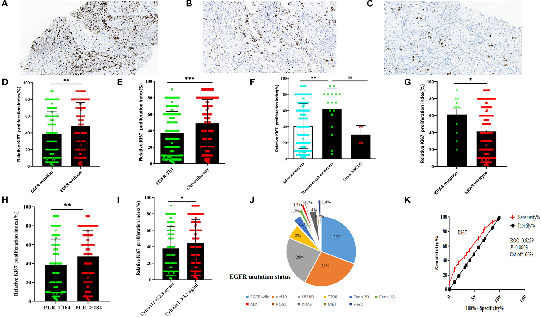 The immunohistochemistry of Ki-67 proliferation index and the relationship between clinical-pathological features in NSCLC. The immunohistochemistry of Ki-67 proliferation index was 85% (A), 50% (B), and 8% (A) (scale bar = 100 μm); The EGFR-mutant status (D), treatment regimens (E), pathological types (F), and KRAS-mutant status (G), PLR ratio, (H) and serum Cyfra211 (I) relationship between Ki-67 proliferation index; (J), the number of patients in NSCLC with EGFR-mutant status; (K) the Ki-67 curve of cutoff value (according to the treatment regimens in 295 NSCLC patients). EGFR mutation = del 19/L858R/T790M/Exon18/Exon 20 insertions, PLR = platelet-to-lymphocyte ratio, other NSCLC = adenosquamous carcinoma, large cell carcinoma and unclassified NSCLC. (nsP > 0.05, *P < 0.05, **P < 0.01, ***P < 0.001, mean ± SD, t-test). EGFR, epidermal growth factor receptor; NSCLC, non-small cell lung cancer; TKIs, tyrosine kinase inhibitors.