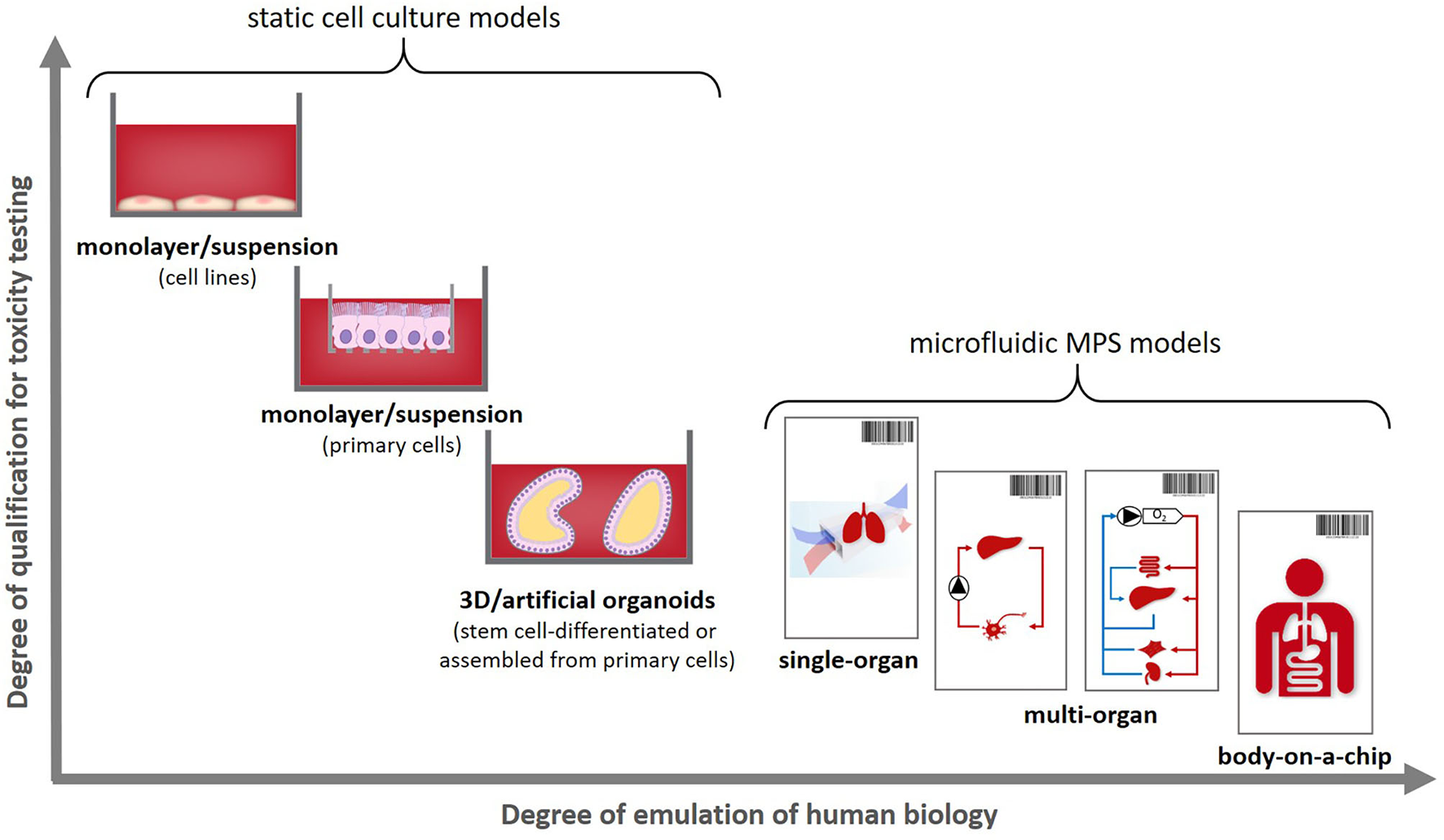 Substantial efforts have been made over the past two decades to improve organ model culture conditions by introducing them into MPS. Dozens of human organ equivalents in MPS have been established using primary- and cell line-based models and have been reviewed in great detail (105–111). It is well-documented that the maturation of organ function can be achieved by closely emulating organotypic microenvironments regarding biochemical, physical, or electrical stimuli (106).